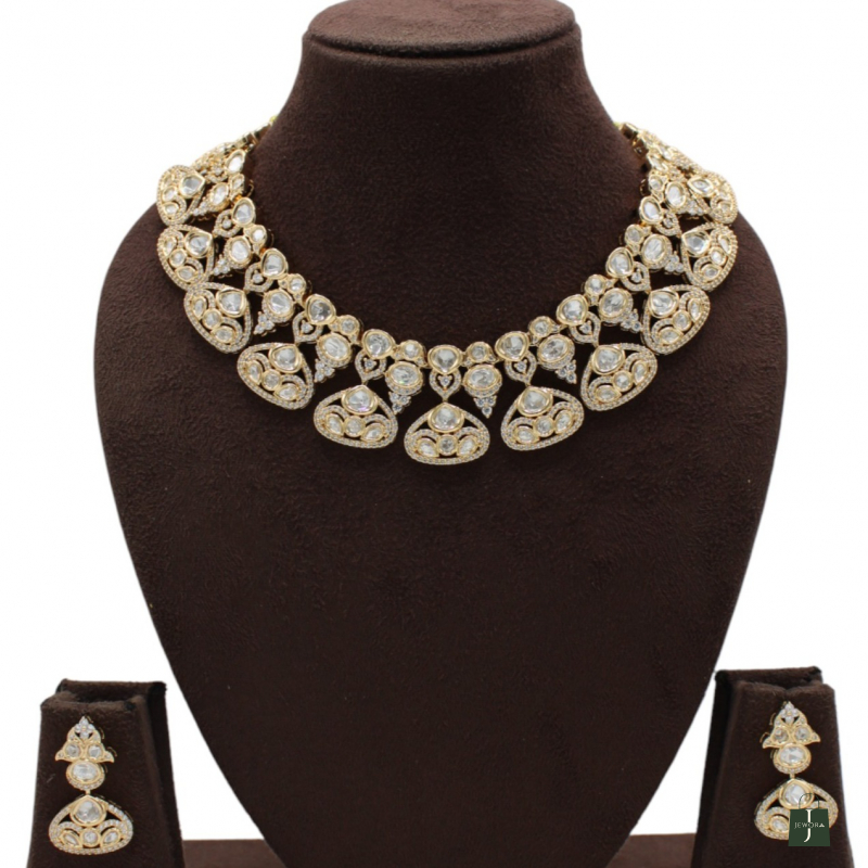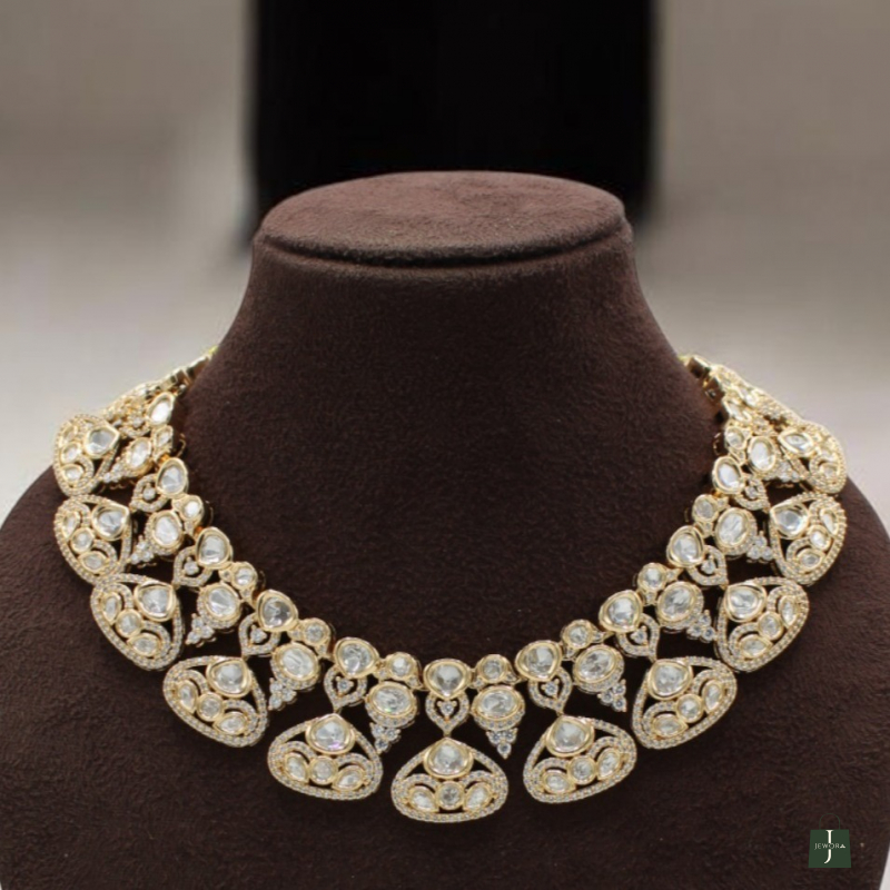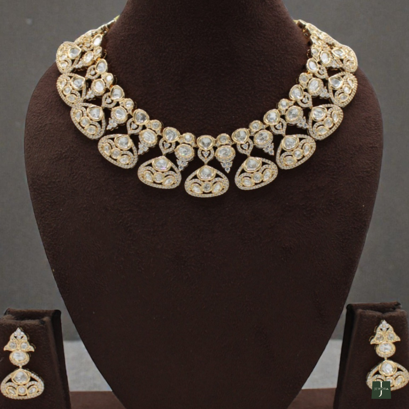 This stunning Kundan necklace set showcases timeless elegance with beautifully arranged teardrop motifs. Adorned entirely with shimmering white Kundan stones, the necklace creates a graceful and luxurious look. The layered drop design gives a rich bridal appeal while maintaining a sophisticated balance.