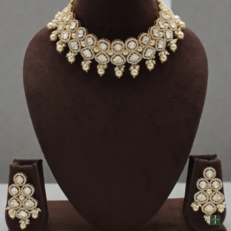 Delicate ivory pearl drops hang along the lower edge, adding softness and subtle movement. The matching earrings mirror the layered teardrop stone design with pearl accents, making this set perfect for weddings, festive occasions, and elegant celebrations.