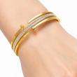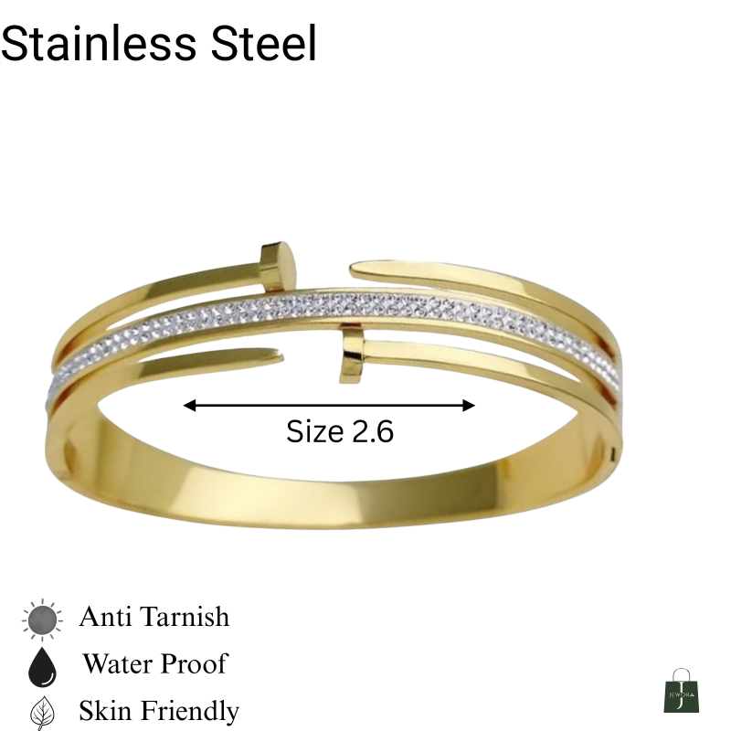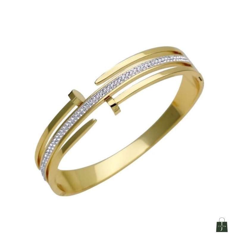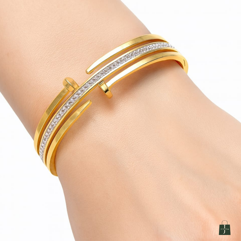 Make a bold yet refined statement with the LustraLine Gold Split Cuff Bracelet. Featuring a sleek asymmetrical band and a shimmering row of white stones set in a silver-toned channel, this bracelet blends contemporary design with timeless elegance. Whether paired with ethnic wear or evening ensembles, it adds instant sophistication to your look.