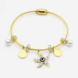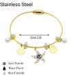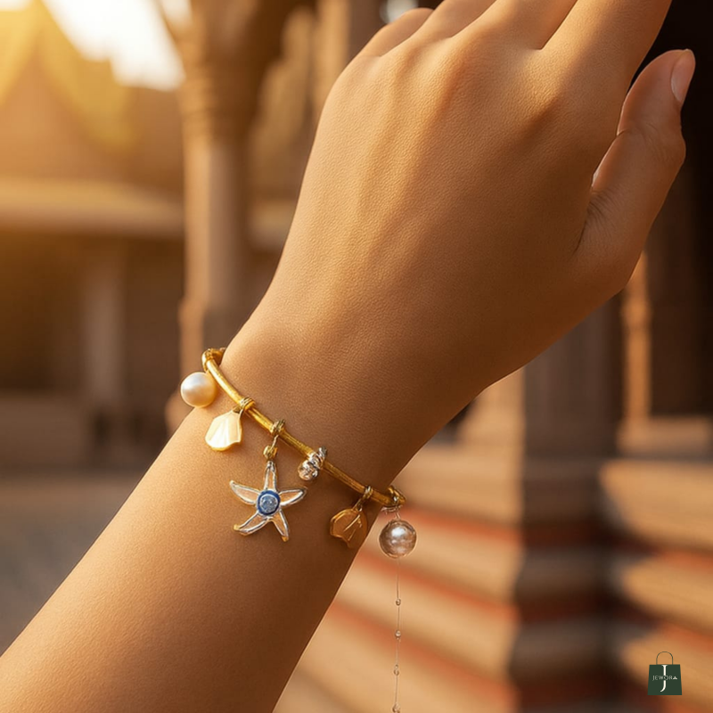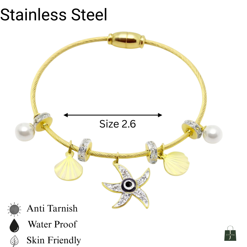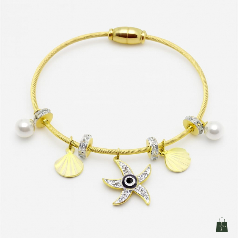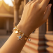 Inspired by golden shores and sunset strolls, the SunTide™ Gold Charm Bracelet brings together oceanic motifs and timeless elegance. Featuring a radiant starfish charm with a blue gemstone, a lustrous pearl drop, and floral accents, this bracelet evokes the serenity of coastal escapes. Perfect for vacation styling or adding a breezy charm to your everyday look.