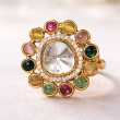 A stunning gold-toned adjustable ring featuring a circular design with a central oval stone surrounded by eight oval clear Kundan stones. Each Kundan stone is encircled with tiny sparkling zirconia accents, adding luxurious brilliance to the piece. Ideal for festive or everyday glamour, this ring offers elegant, traditional Indian craftsmanship with a modern touch.