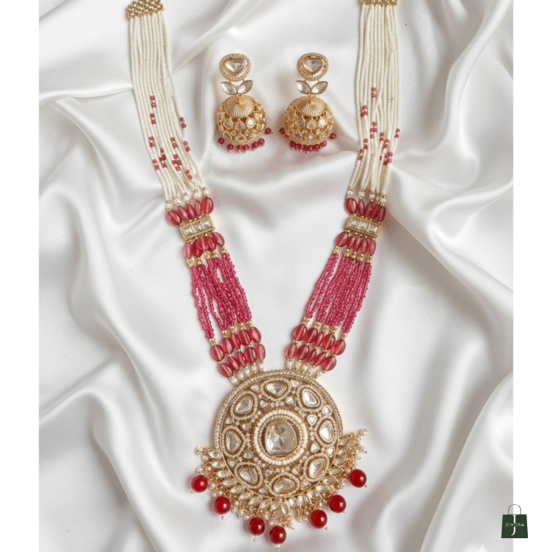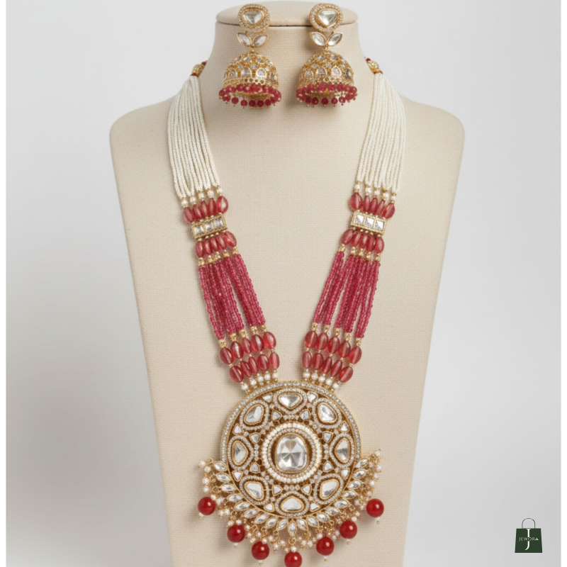 Elevate your festive and wedding look with the KAVYA ROYAL KUNDAN PEARL LONG NECKLACE SET, a statement piece that blends classic elegance with timeless craftsmanship. Designed with multi-layered pearl strands and rich ruby-toned bead detailing, this necklace is beautifully finished with an ornate circular kundan pendant that exudes regal charm.