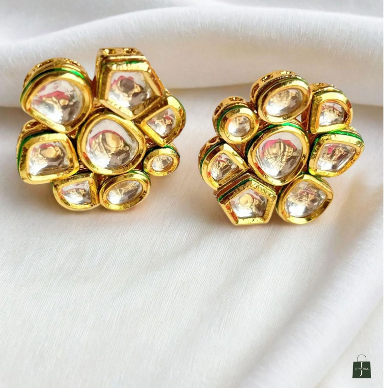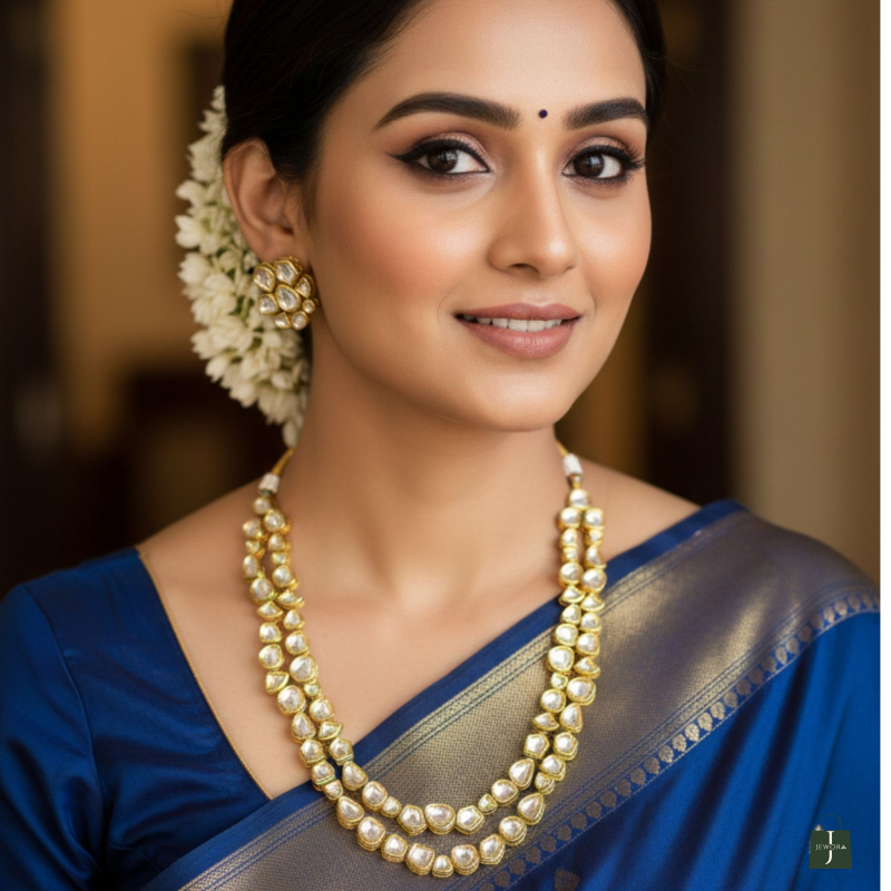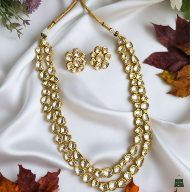Designed to sit gracefully on the neckline, the necklace is paired with matching kundan stud earrings that enhance the overall regal appeal. This versatile piece complements sarees, lehengas, and anarkalis effortlessly