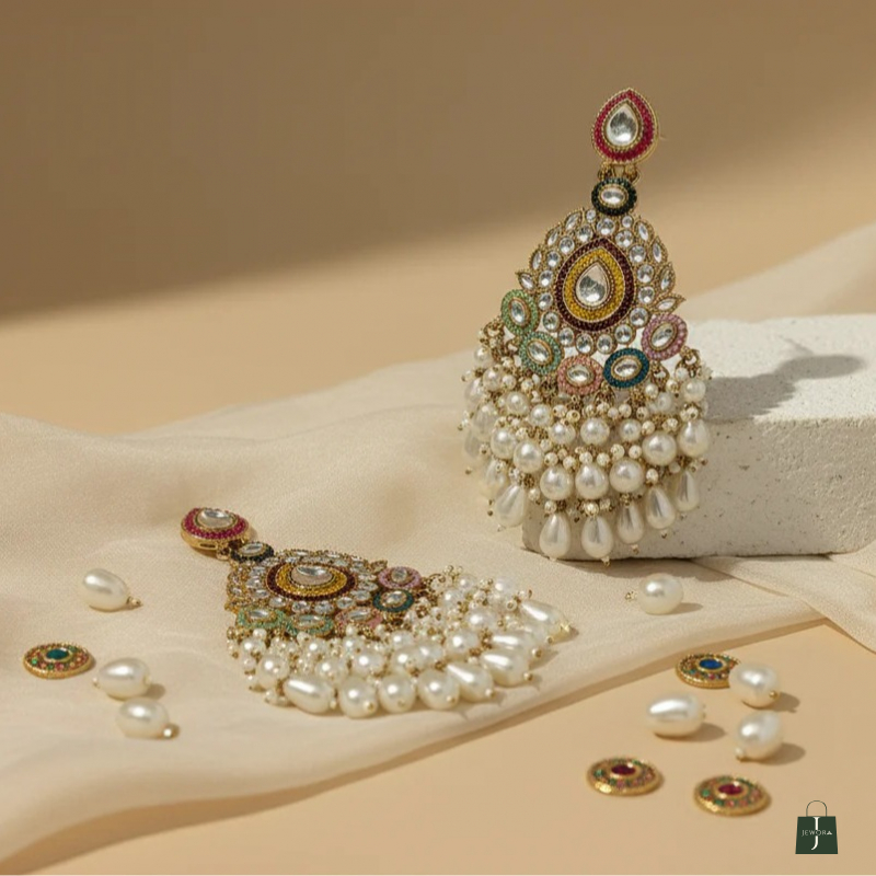 Elevate your festive elegance with the Kiana Pearl Jhaale, a breathtaking blend of traditional artistry and radiant charm. Designed with intricate multicolor detailing and adorned with clusters of lustrous pearl drops, these statement jhaale earrings bring a regal touch to any ethnic ensemble. Their grand silhouette, enriched with vibrant stones and delicate craftsmanship, makes them an irresistible choice for weddings, festive celebrations, or any occasion where you want to shine with timeless beauty.