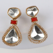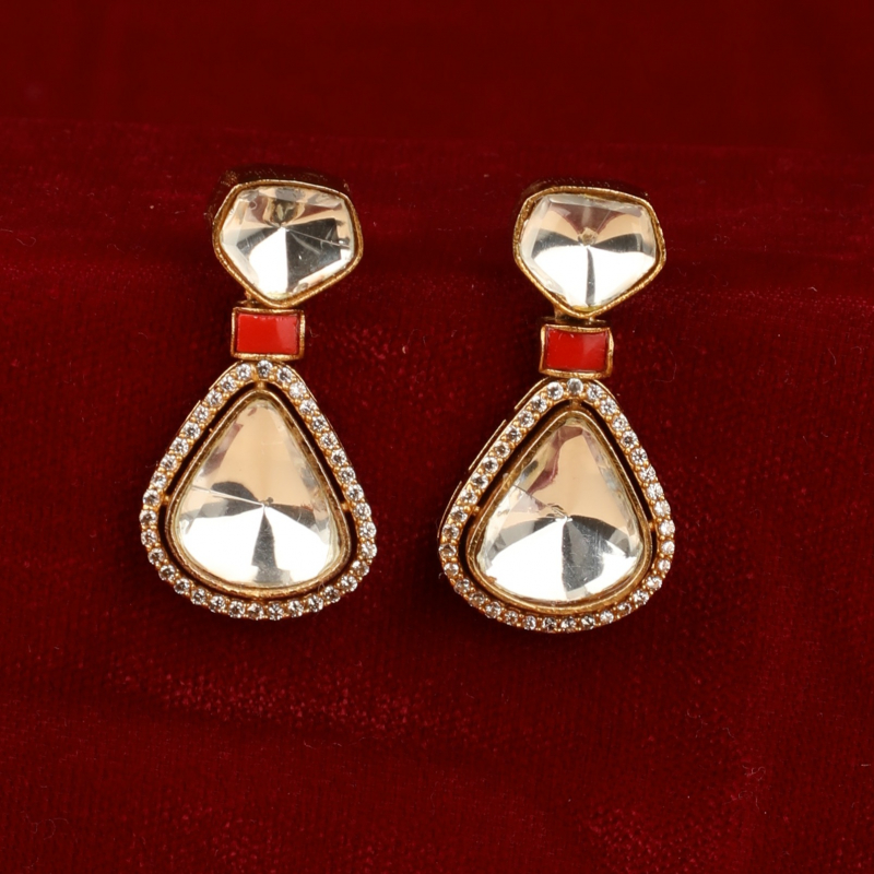 Minimal yet striking, these elegant drop earrings feature mirror-finish kundan stones set in a soft teardrop silhouette, beautifully framed with delicate crystal detailing. A subtle pop of red enamel at the connector adds warmth and contrast, while the gold-tone setting enhances the overall refined appeal. Designed to catch the light effortlessly, these earrings bring understated luxury to any look.
