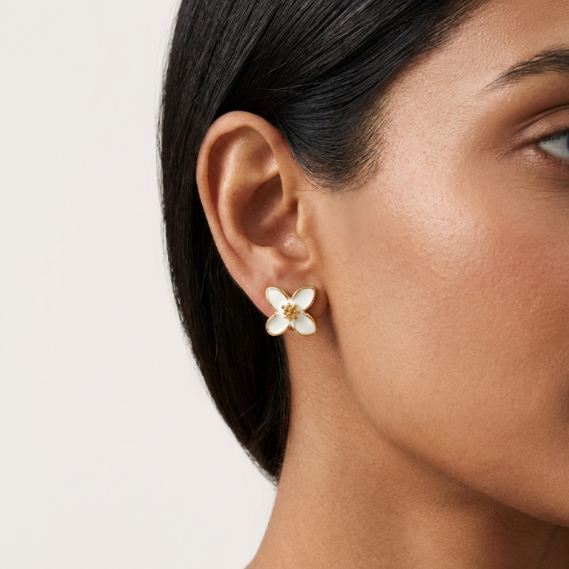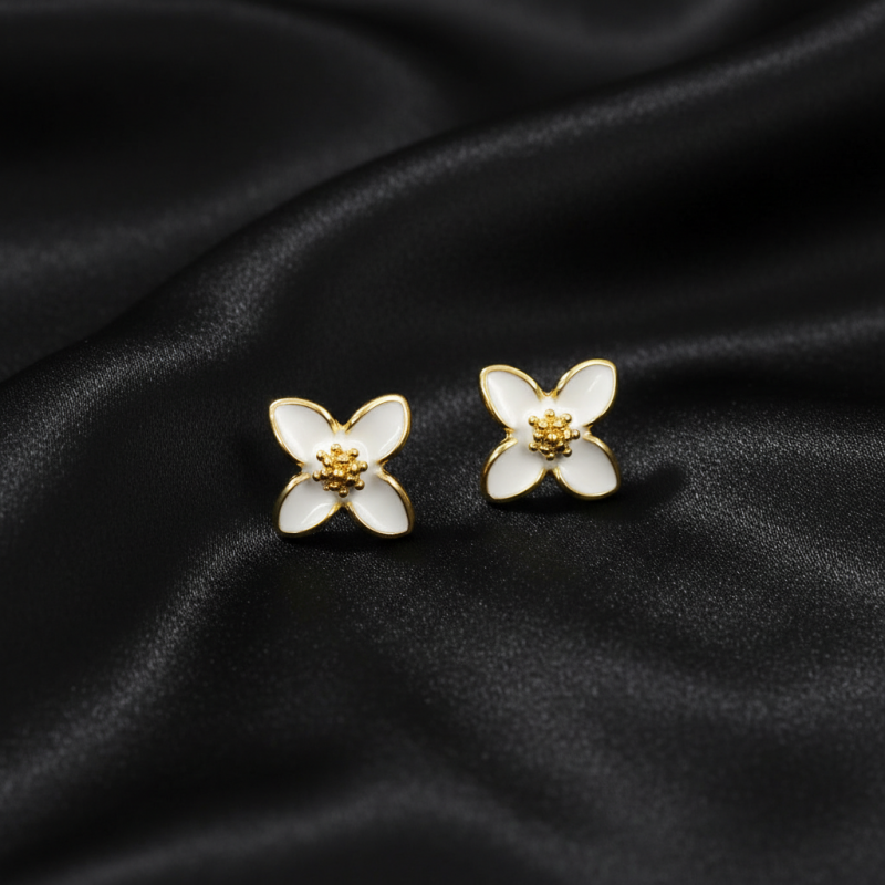 Delicate white enamel petals meet lustrous gold — our Jasmine Bloom Studs capture the quiet elegance of a flower in full bloom. Each earring features four soft white petals framed in polished gold with an intricate granulated gold centre, inspired by the timeless jasmine flower. Lightweight and effortlessly wearable, these studs transition beautifully from morning errands to evening occasions. Perfect as a everyday staple or a thoughtful gift for someone special.