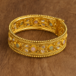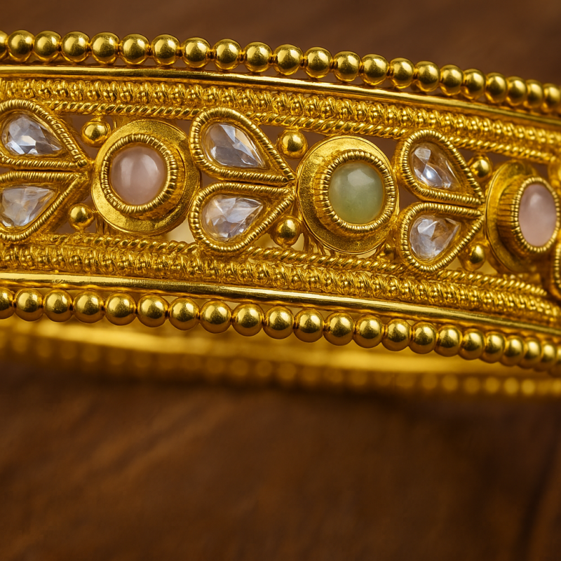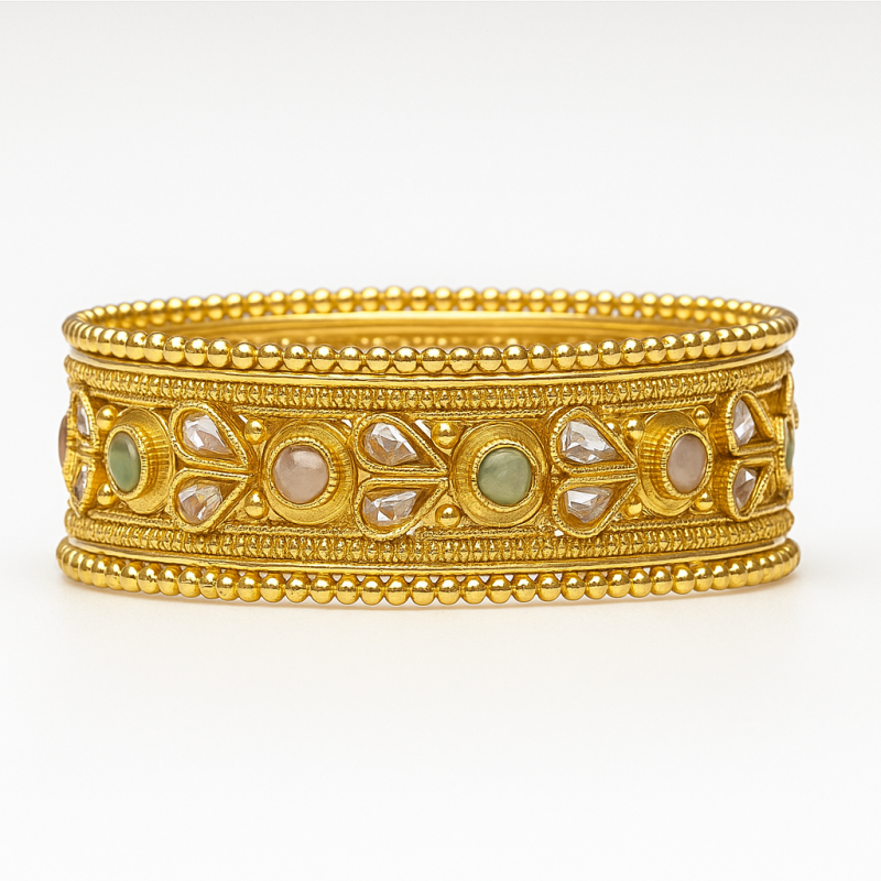 Add a royal touch to your traditional attire with the Kundan Floral Polki Kada Bangle. This handcrafted piece is designed with intricate floral patterns and embellished with pastel pink and green stones alongside glimmering Polki work, giving it a luxurious finish. The golden base is highlighted with fine detailing, making it a timeless ornament for women who love traditional Indian craftsmanship.