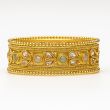 Add a royal touch to your traditional attire with the Kundan Floral Polki Kada Bangle. This handcrafted piece is designed with intricate floral patterns and embellished with pastel pink and green stones alongside glimmering Polki work, giving it a luxurious finish. The golden base is highlighted with fine detailing, making it a timeless ornament for women who love traditional Indian craftsmanship.
