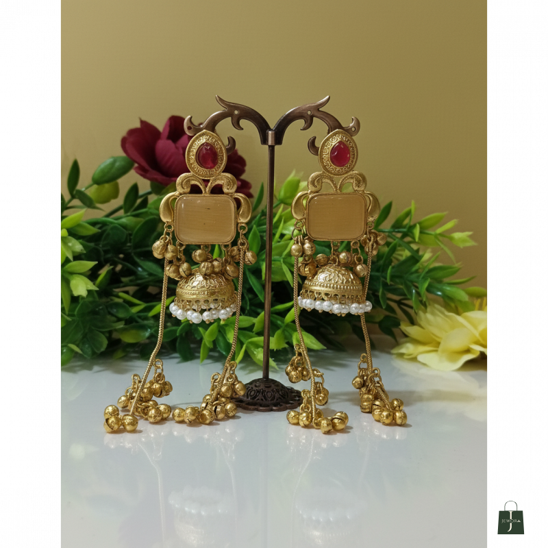 The centerpiece is a classic dome-shaped jhumka, richly finished with fine gold detailing and bordered with a subtle row of pearl-like beads that enhance its graceful look. Flowing down from the jhumka are multiple delicate chain tassels adorned with tiny gold beads, creating beautiful movement and a soft, rhythmic sway when worn.