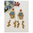 These elegant long earrings feature a floral kundan-style stud at the top, finished in a soft gold tone with intricate textured detailing. Below the stud sits a square mint-green stone accent, adding a fresh pop of color and a modern contrast to the traditional design.