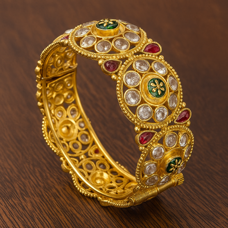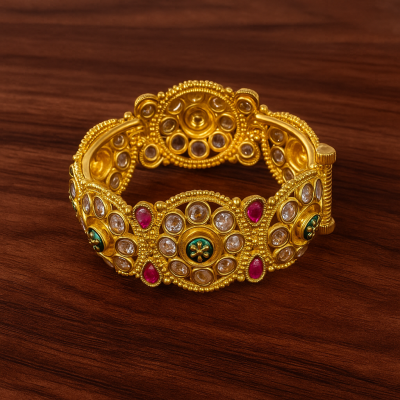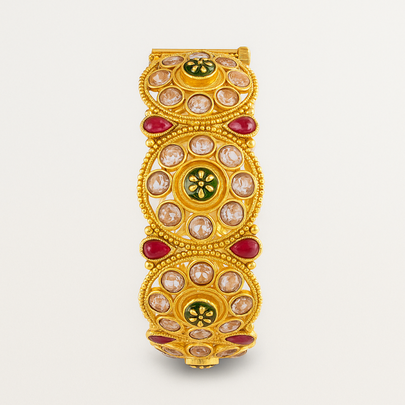 Elevate your traditional attire with this exquisite Kundan Meenakari Kada, adorned with intricate detailing and vibrant multicolor stones. Designed in a rich gold polish, this kada showcases round kundan settings with striking ruby red and emerald green accents, complemented by meenakari floral work at the center. The secure screw closure ensures a comfortable and reliable fit, making it perfect for festive celebrations and bridal occasions. Crafted from premium alloy with timeless craftsmanship, this kada is a heritage-inspired masterpiece that every woman should own.