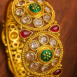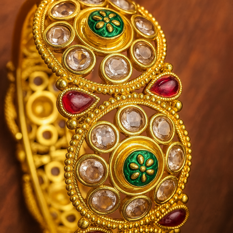 Elevate your traditional attire with this exquisite Kundan Meenakari Kada, adorned with intricate detailing and vibrant multicolor stones. Designed in a rich gold polish, this kada showcases round kundan settings with striking ruby red and emerald green accents, complemented by meenakari floral work at the center. The secure screw closure ensures a comfortable and reliable fit, making it perfect for festive celebrations and bridal occasions. Crafted from premium alloy with timeless craftsmanship, this kada is a heritage-inspired masterpiece that every woman should own.