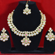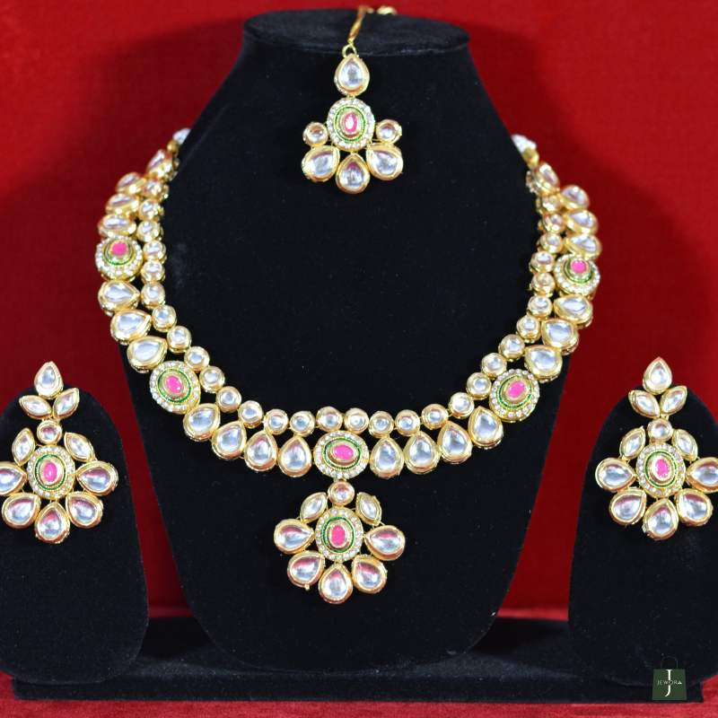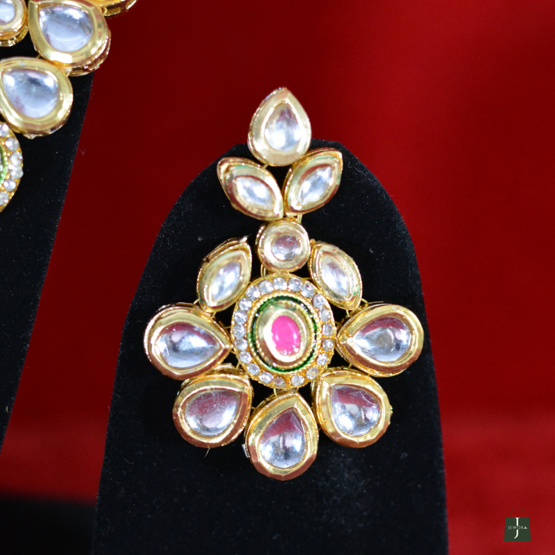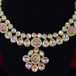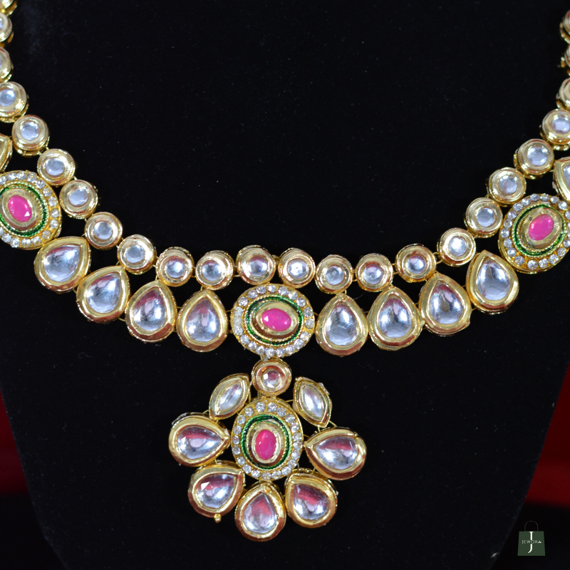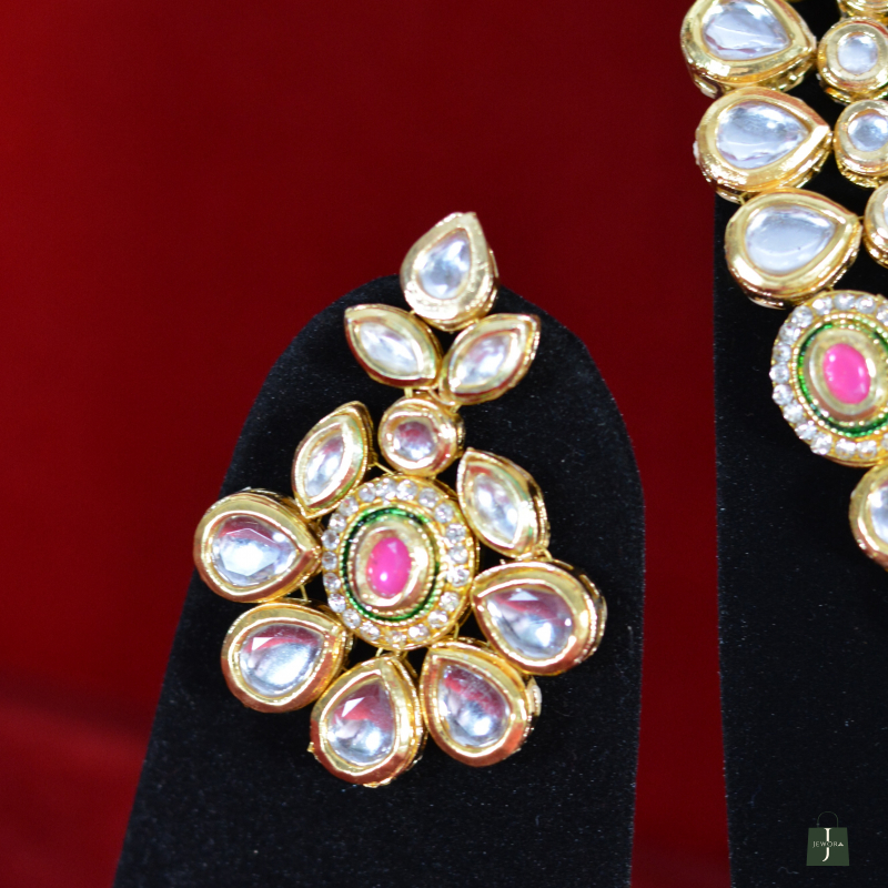Showcasing soft pink stone centerpieces, this Kundan Necklace Set delivers refined elegance with a feminine touch. The coordinated earrings enhance its premium appeal, making it suitable for festive wear, bridal functions, and gifting—offering standout beauty without the feel of overly heavy jewelry.