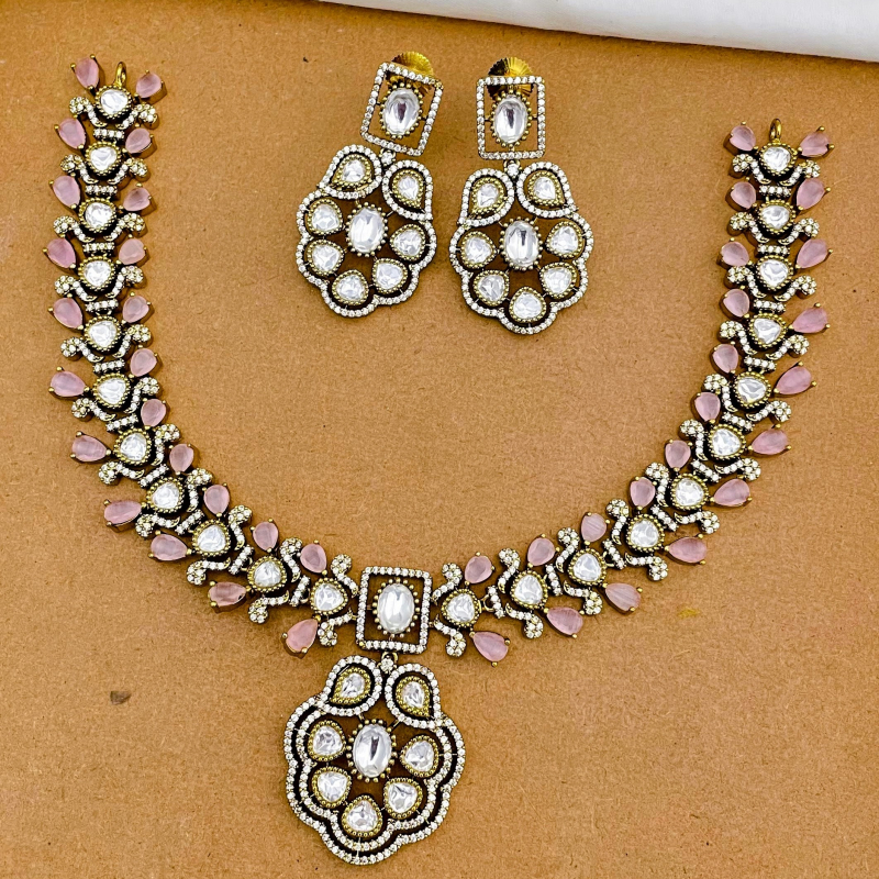 indulge in the luxury of this majestic Regal Kundan Necklace and Earrings set-an epitome of traditional Indian artistry.The necklace features a breath taking design,intricately adorned with semi-precious ruby,emerald and white doublet stone.Finished with opulent silver plating,this set exudes timeless beauty,while kundan stones embedded with CZ diamonds,lend an air of regal sophistication.