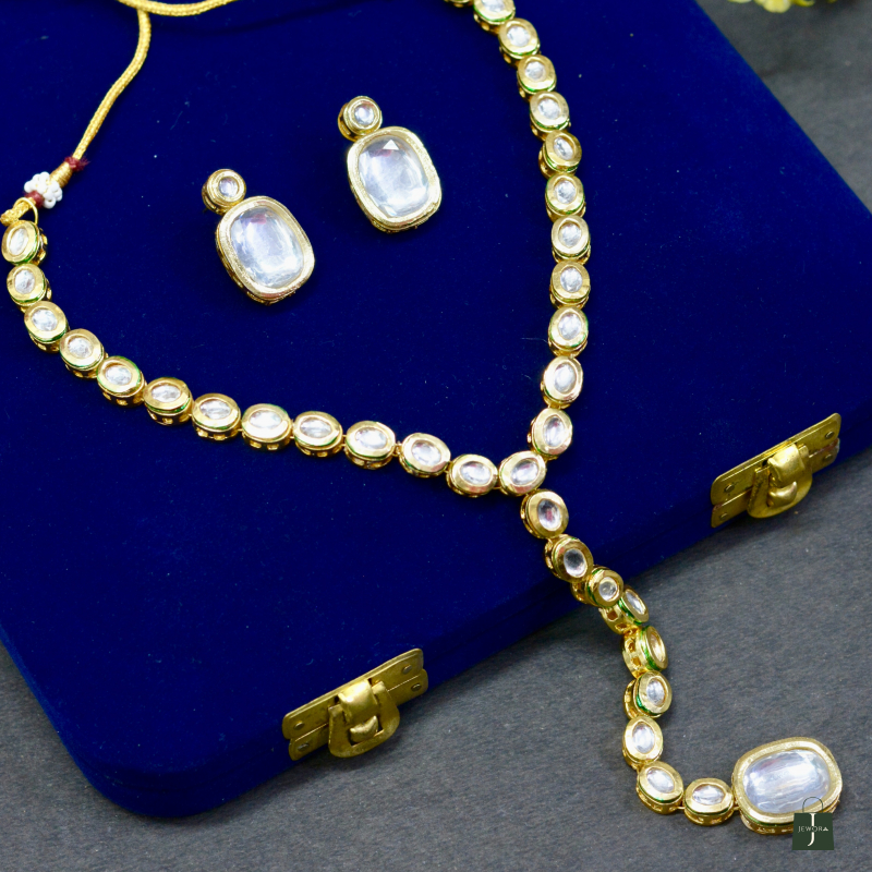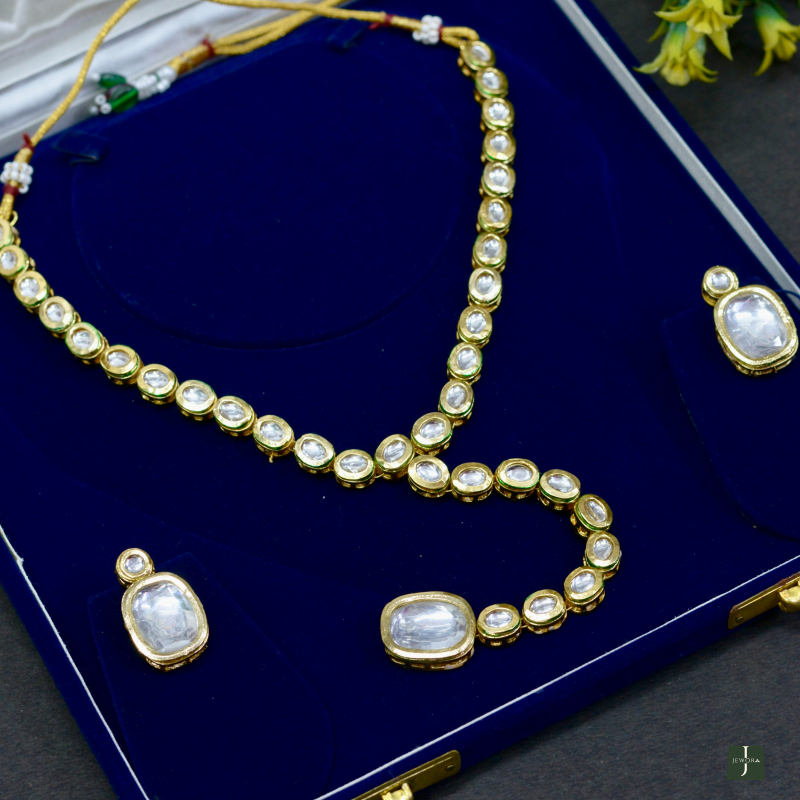 Featuring smooth oval-cut Kundan stones arranged in a classic silhouette, this necklace set reflects refined craftsmanship and elegant symmetry. The polished finish and subtle sparkle give it a premium appeal, making it ideal for festive occasions and traditional outfits with excellent value.