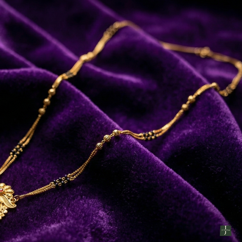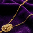 Embrace the perfect harmony of tradition and grace with this Antique Gold-Plated Long Mangalsutra. This exquisite piece features a majestic circular medallion pendant, intricately crafted with traditional filigree and vibrant enamel accents that celebrate classic artistry. The design is elegantly suspended from a sophisticated double-string chain, meticulously interspersed with sacred black beads and textured gold accents to create a regal silhouette.