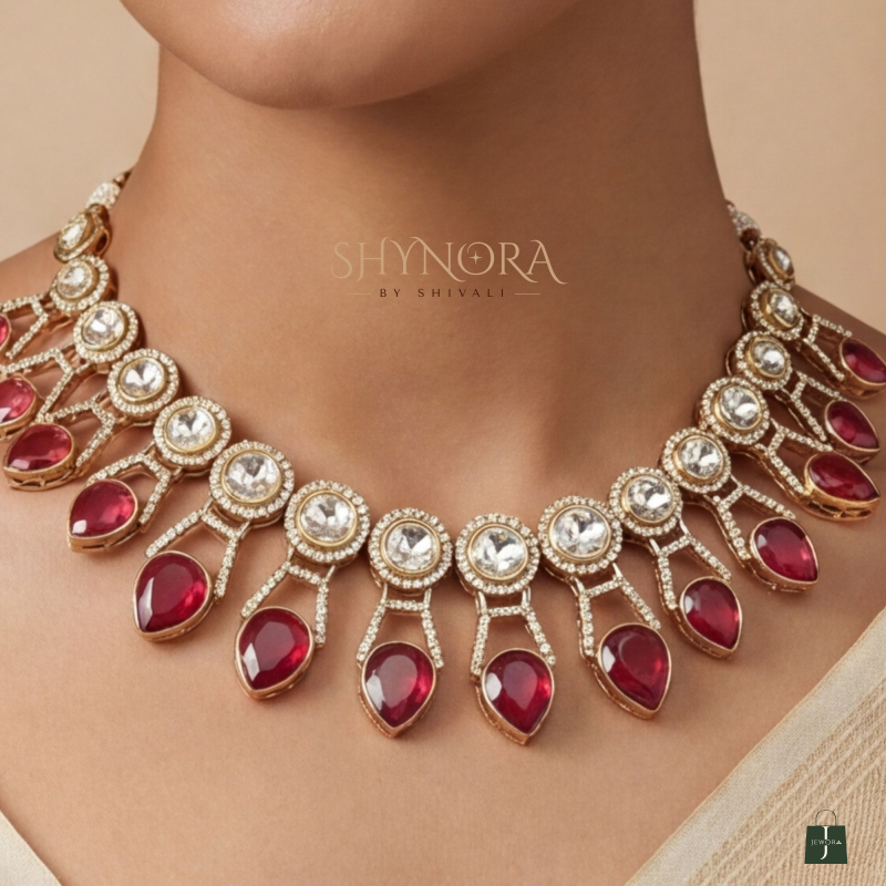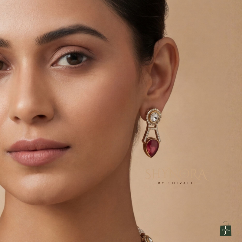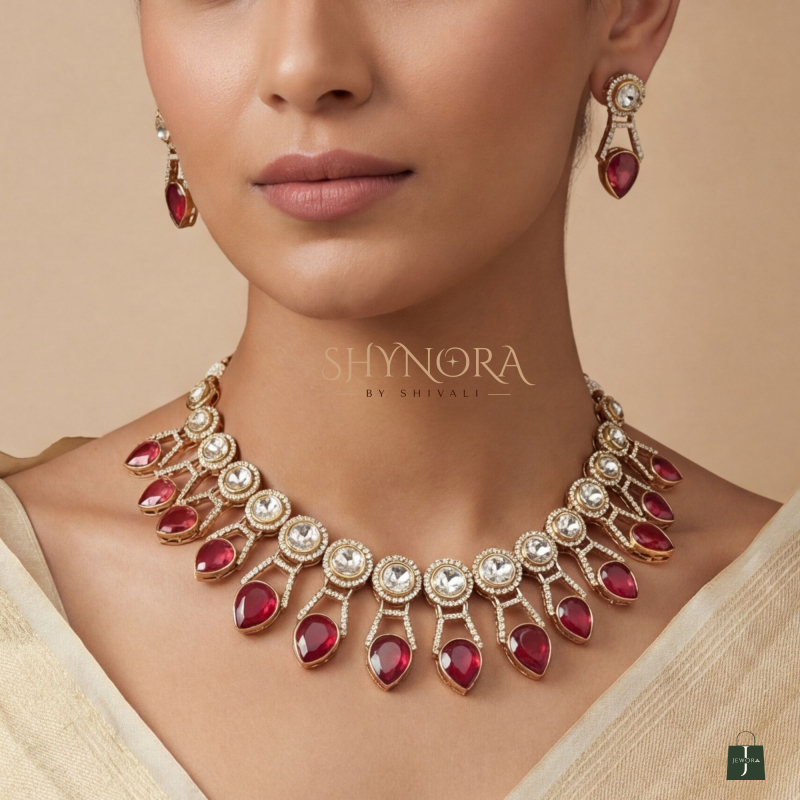 The minimalist yet luxurious arrangement makes this set perfect for those who love subtle glamour with a royal touch. Paired with matching ruby drop earrings, itβs ideal for cocktail events, festive evenings, and elegant wedding looks.
