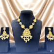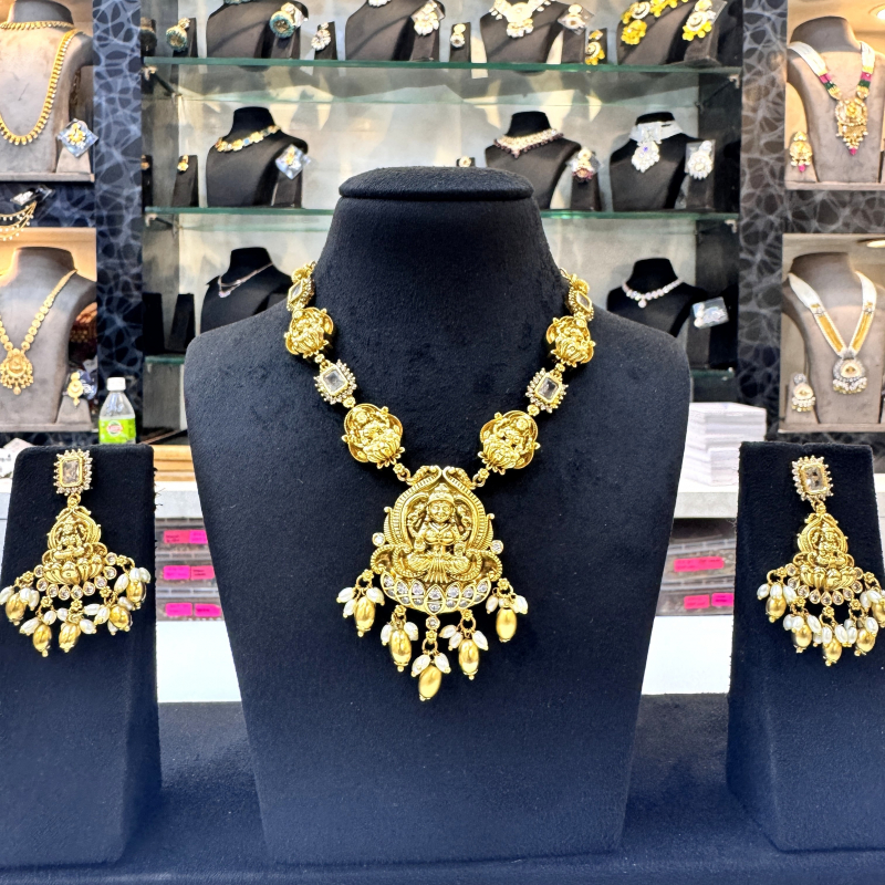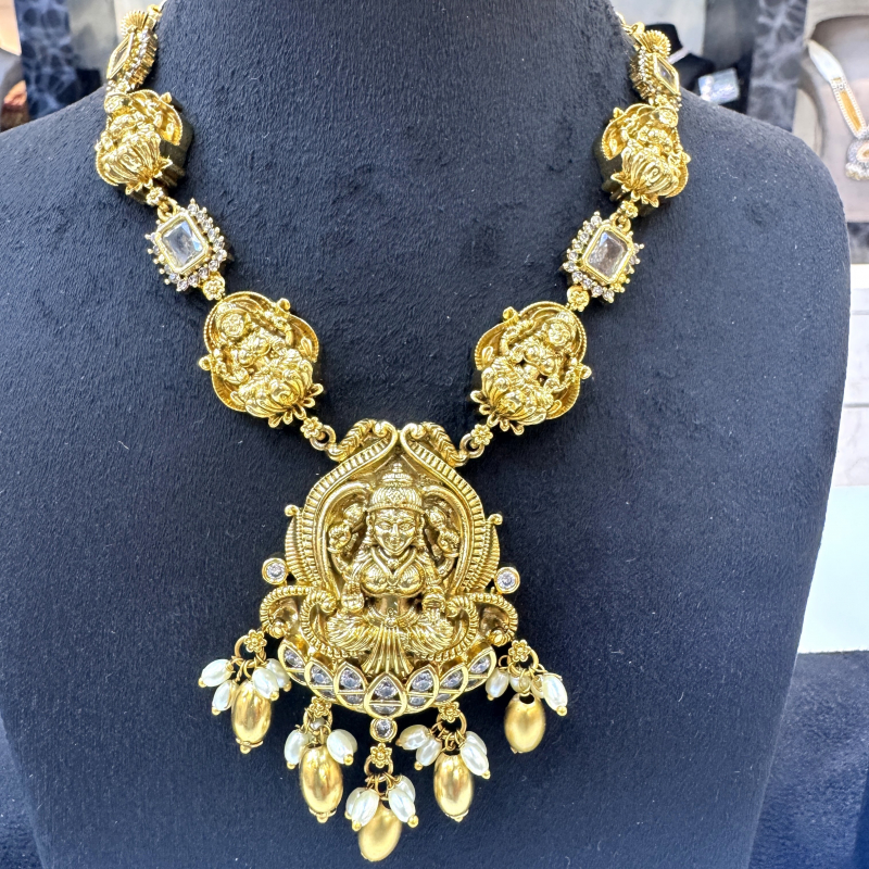 Perfect for bridal wear, festive occasions, and cultural celebrations, this necklace set showcases exceptional craftsmanship rooted in heritage. The antique finish combined with temple motifs gives it a regal charm, making it an ideal heirloom-worthy piece. Pair it with sarees, lehengas, or traditional attire to complete your divine look.