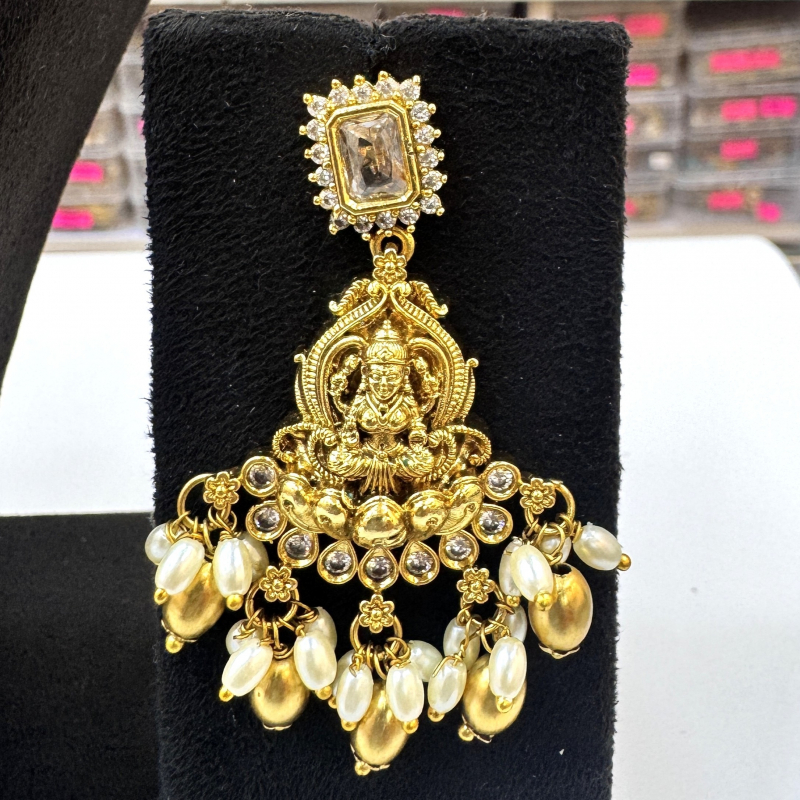 Elevate your traditional jewellery collection with the Lakshmi Grace Antique Temple Necklace Set from Jewora. This exquisite set features a finely crafted temple-inspired design with a majestic Lakshmi pendant at the centre, symbolizing prosperity and divine blessings. Adorned with antique gold plating, intricate detailing, and delicate pearls, this set brings timeless elegance to every ensemble.