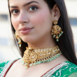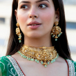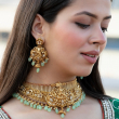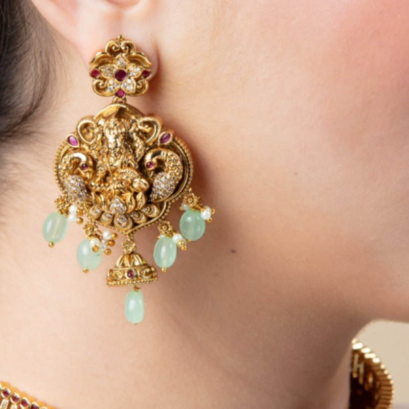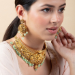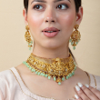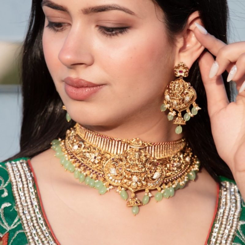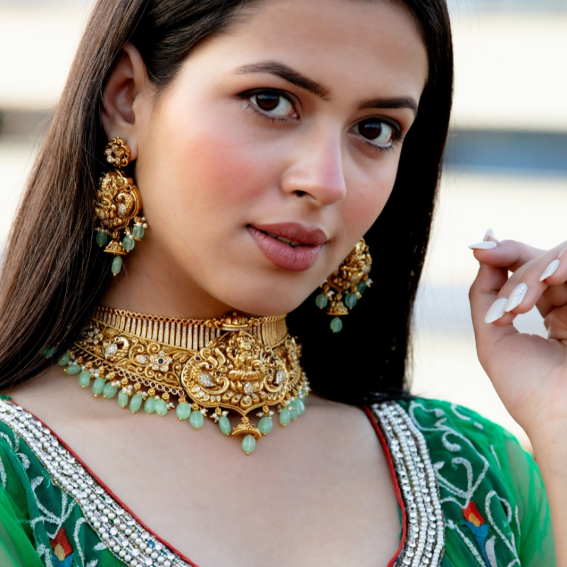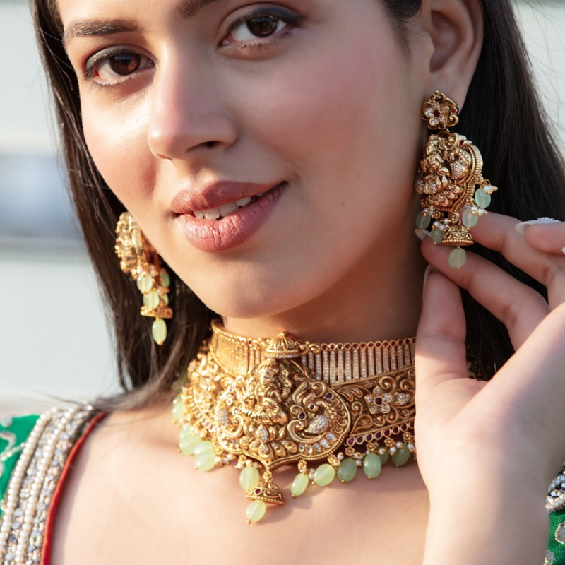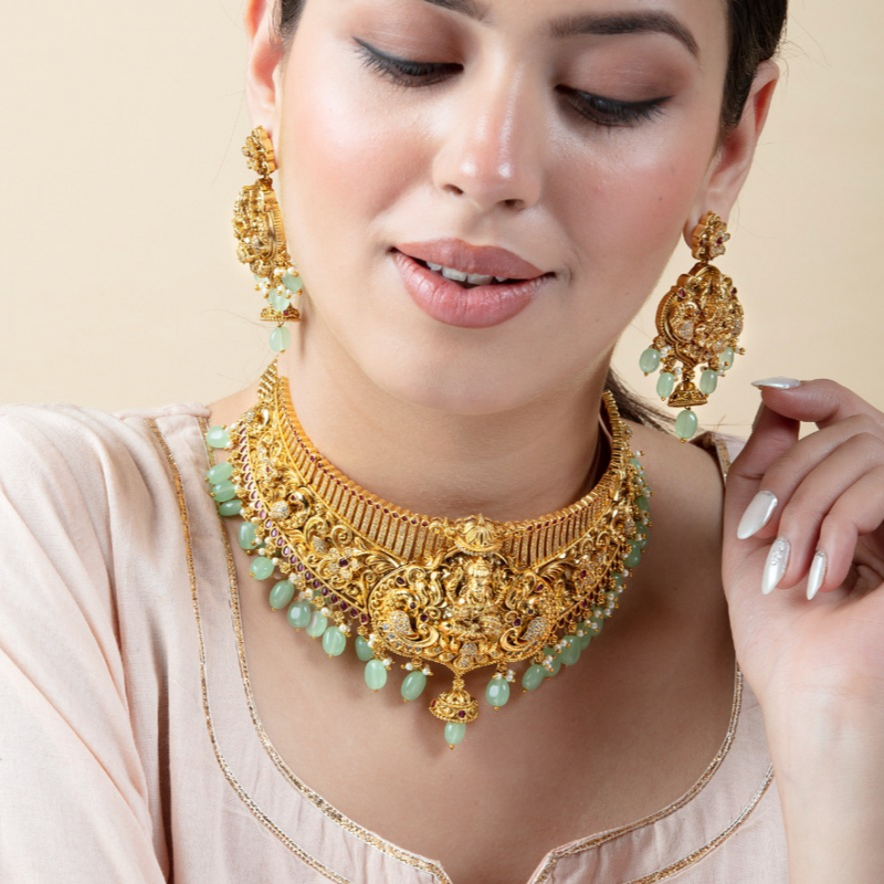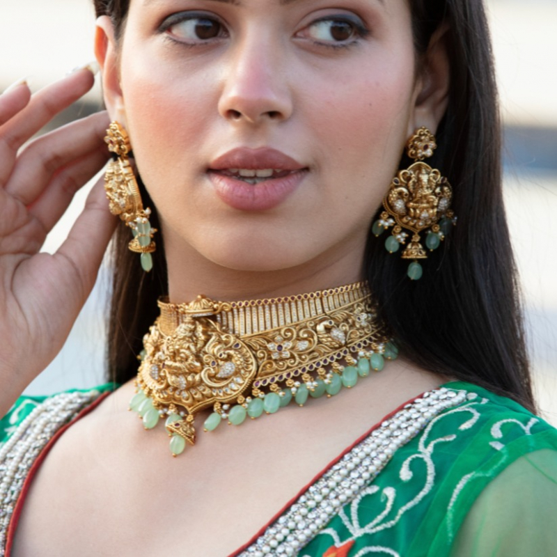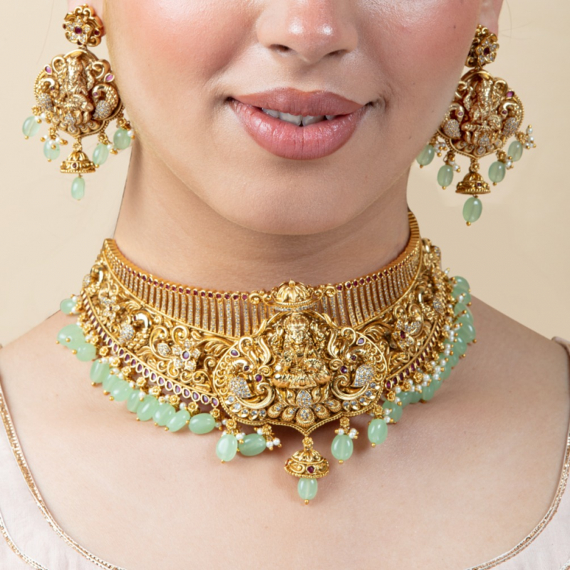 Celebrate timeless tradition with this exquisite temple jewellery choker set, intricately crafted with a divine Lakshmi motif at the center. The antique gold finish enhances its regal appeal, while detailed carvings and embedded stones add richness to the design. Finished with soothing mint green bead drops, this set beautifully blends heritage craftsmanship with elegant aesthetics. Paired with matching temple-style earrings, it is perfect for weddings, bridal wear, and festive occasions.