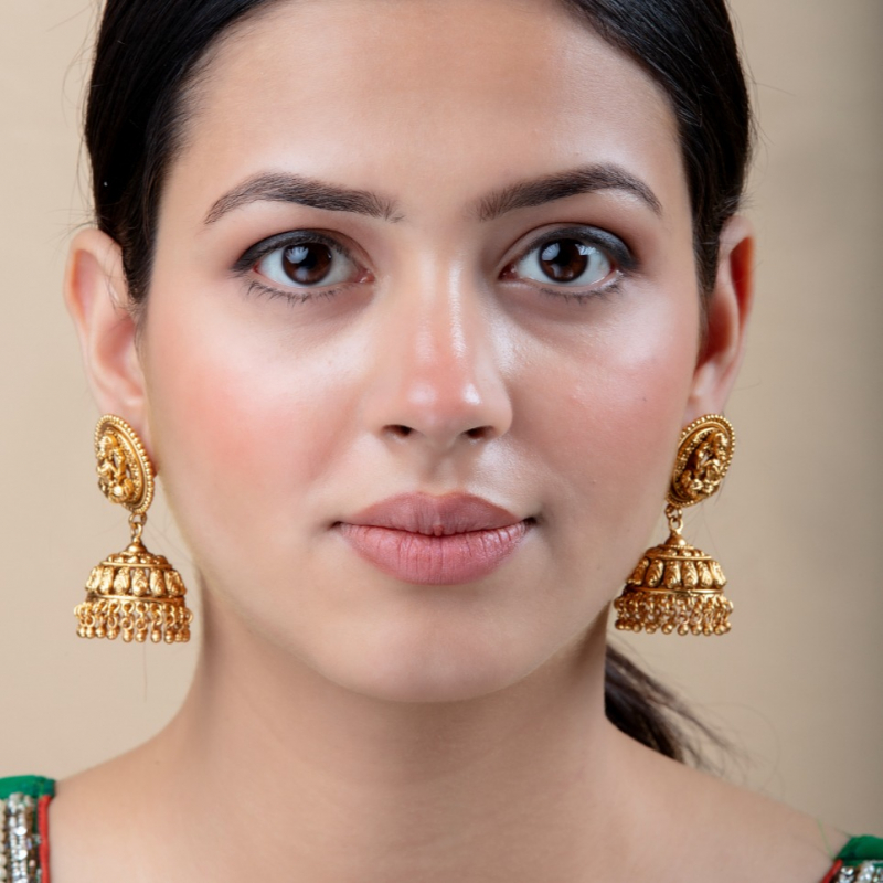 Add a touch of divine elegance to your jewelry collection with these beautifully crafted temple jhumka earrings. Featuring a finely detailed Lakshmi motif stud, these earrings symbolize prosperity and grace while showcasing traditional South Indian artistry.