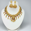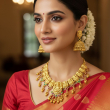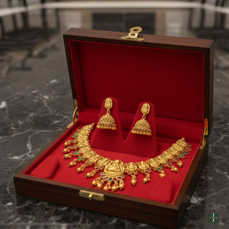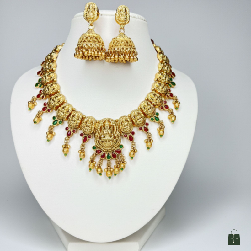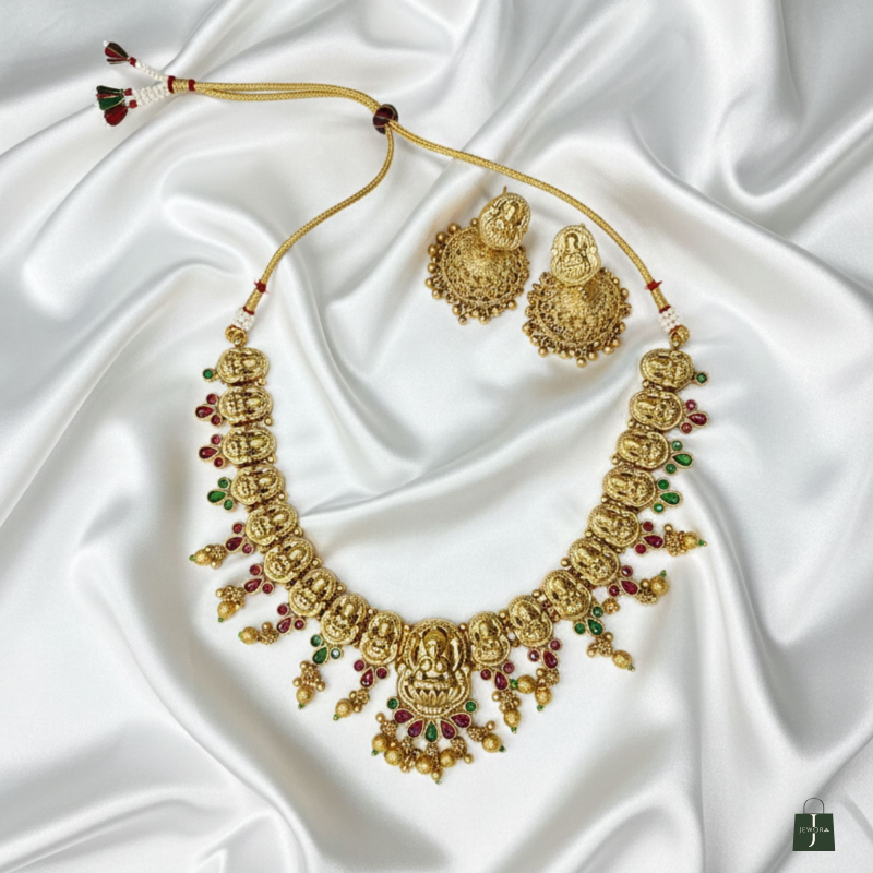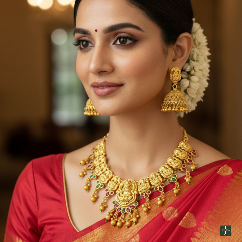 Celebrate timeless tradition with this beautifully crafted Lakshmi Temple Necklace Set, inspired by classic South Indian temple jewellery. Featuring intricately detailed Goddess Lakshmi motifs with an antique gold finish and rich red–green stone accents, this necklace reflects divine grace and heritage craftsmanship.