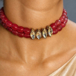 A delicate pastel pink choker adorned with timeless Kundan stones, crafted to reflect understated royalty. Designed with soft blush-toned onyx beads, this piece beautifully blends subtle elegance with traditional detailing.