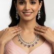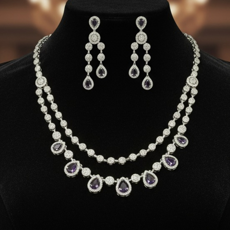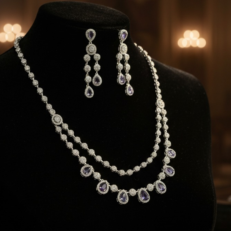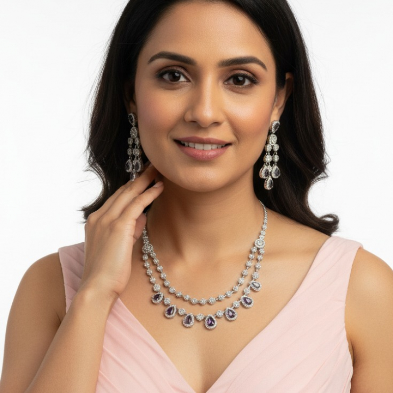 Add a touch of graceful charm to your look with this stunning lavender-inspired double-layer necklace set. Designed with shimmering American Diamond floral clusters, the upper layer enhances the neckline with delicate brilliance, while the lower layer features elegant pear-shaped lavender stones framed in sparkling halos. The matching chandelier-style earrings beautifully complement the layered design, creating a refined and sophisticated ensemble. Perfect for receptions, cocktail parties, and festive occasions, this set radiates timeless elegance.