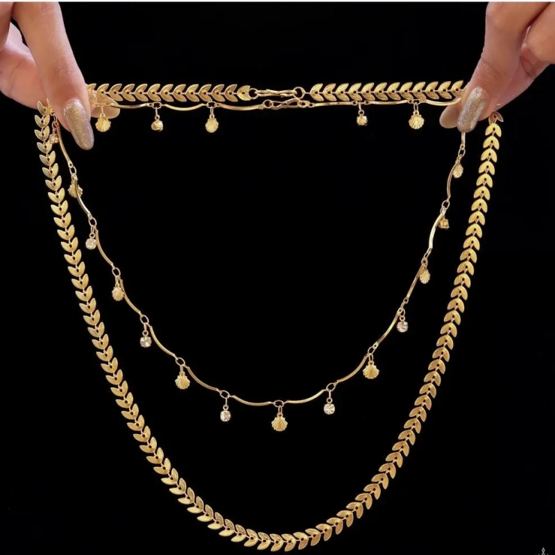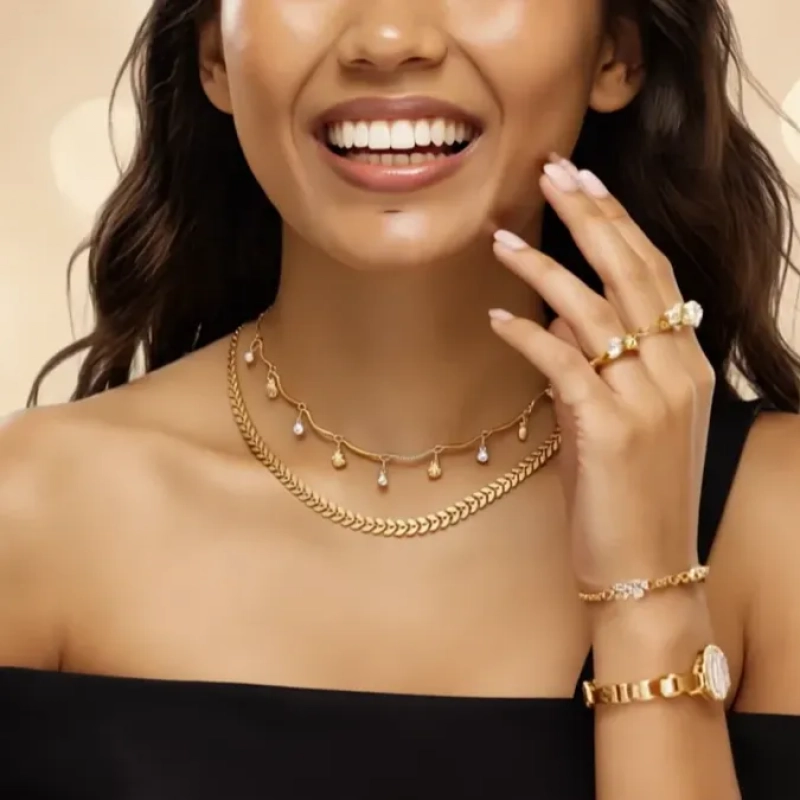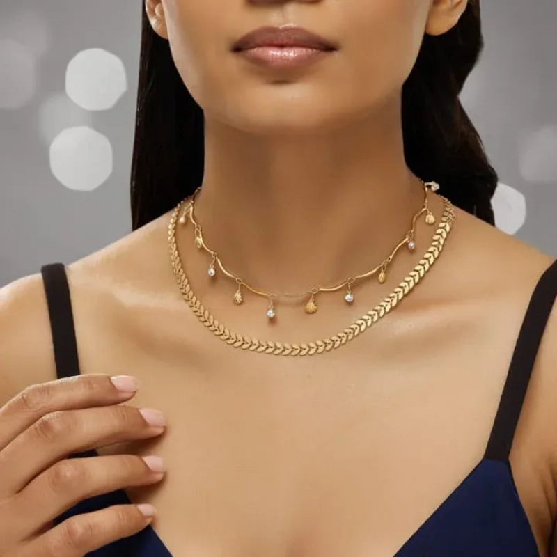 Effortlessly elegant, Ushve’s Layered Charm Chain Necklace blends modern minimalism with delicate feminine charm. Designed with two graceful layers, this necklace features a sleek chevron-style chain paired with a fine charm chain adorned with tiny shimmering drops. The layered design creates beautiful depth and movement, allowing each delicate charm to catch the light softly with every motion. The polished gold-tone finish adds warmth and sophistication, making it a versatile piece that complements both casual and dressy looks. Lightweight and comfortable, this necklace sits beautifully along the neckline, adding a subtle statement without feeling heavy. Whether styled with everyday outfits, evening dresses, or festive ensembles, it brings a refined touch of effortless luxury. Crafted with Ushve’s signature balance of thoughtful design and accessible elegance, this layered necklace is perfect for those who appreciate jewellery that feels both modern and timeless.