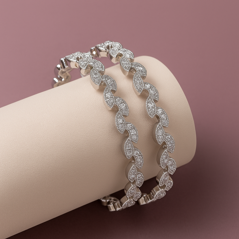 The Leaf Link AD Bangle is a stunning piece of jewellery designed with elegance and modern appeal. Crafted from high-quality alloy and plated in a bright silver finish, this bangle features a series of linked leaf-shaped motifs set with sparkling American Diamond (CZ) stones. Each leaf segment is detailed with small CZ embellishments that enhance the brilliance, making it a statement accessory for party wear and special occasions. The intricate leaf pattern creates a delicate flow around the wrist, ensuring a graceful and eye-catching look. Despite its rich design, the bangle is lightweight and comfortable to wear, offering a perfect balance of style and ease. Its polished silver tone makes it versatile, pairing seamlessly with both ethnic attire like sarees and lehengas, as well as western gowns and dresses. Whether worn alone or stacked with other bangles, the Leaf Link AD Bangle brings timeless elegance to your jewellery collection. This piece is an ideal choice for women who admire refined designs with a nature-inspired touch.