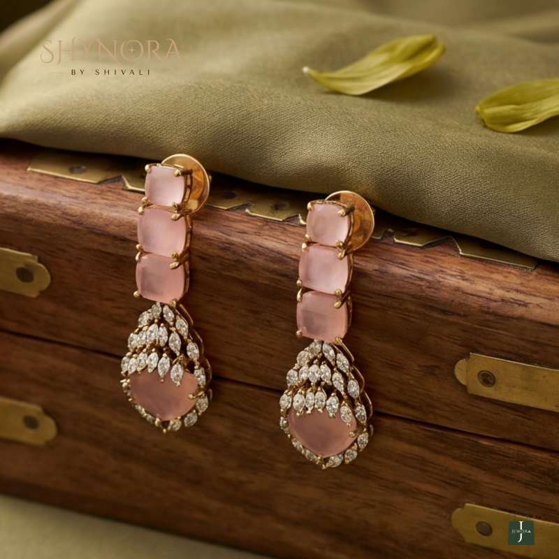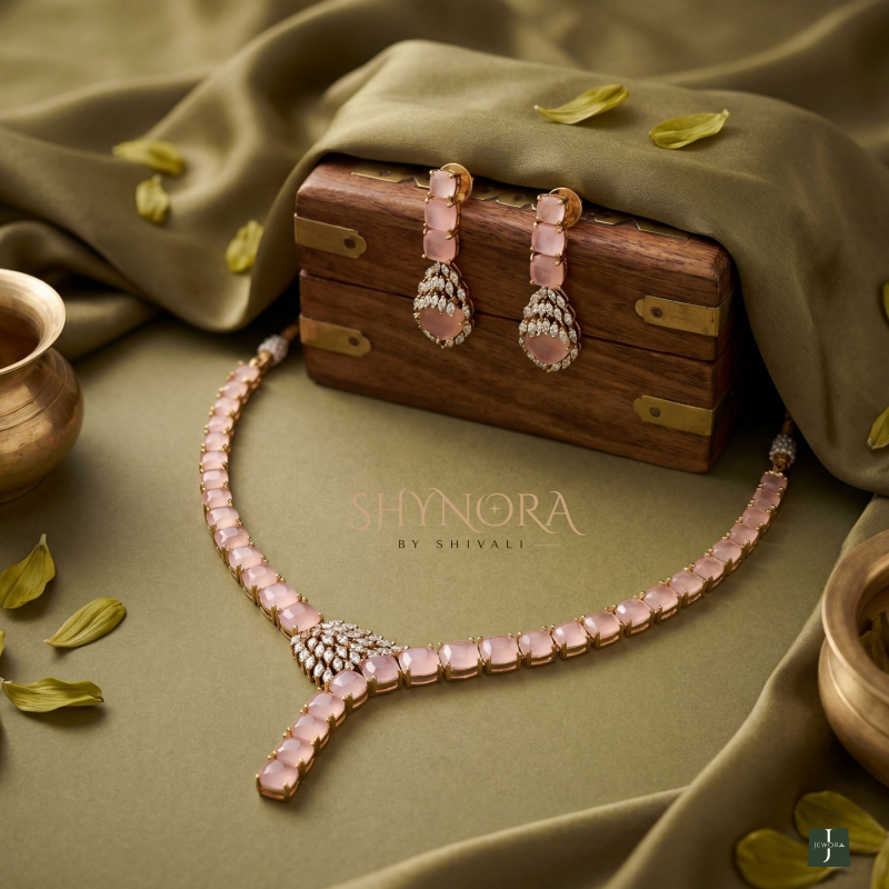 The set is paired with matching light pink drop earrings, making it a perfect blend of subtle glamour and modern elegance.