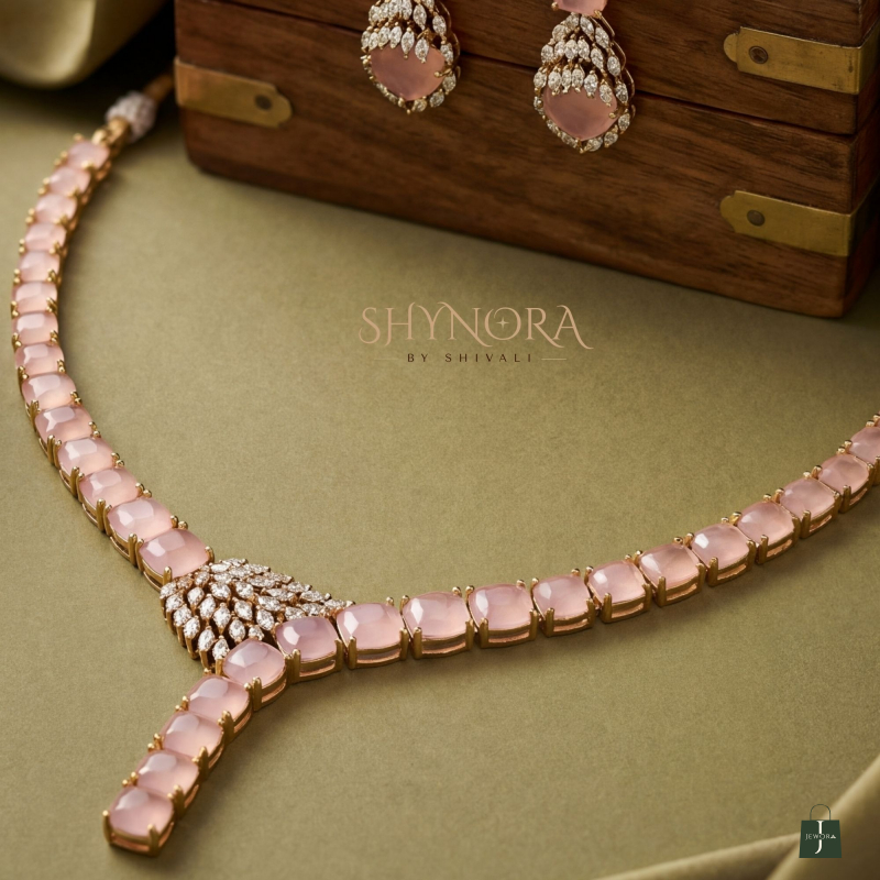 The Light Pink Crystal Y-Drop Necklace Set is a graceful and feminine jewelry piece designed for elegant occasions. Crafted with soft light pink crystal stones, the necklace features a sleek Y-shaped silhouette highlighted by a shimmering teardrop crystal centerpiece, adding a refined sparkle.
