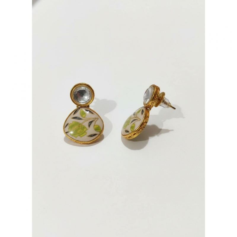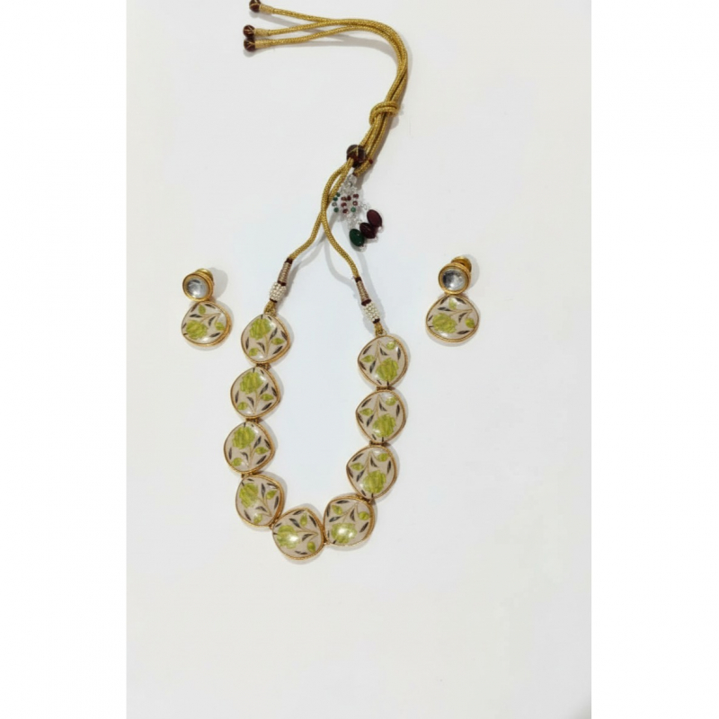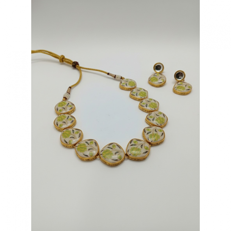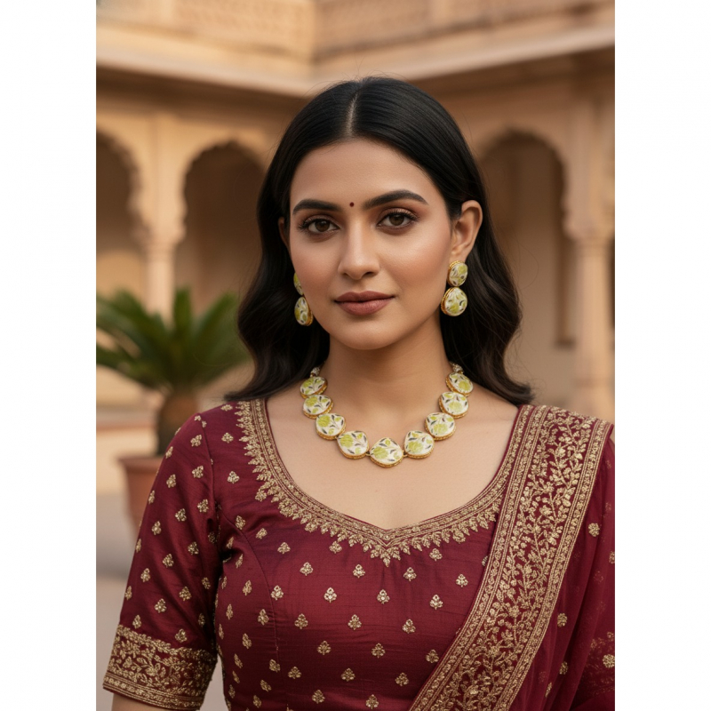Bring a refreshing touch of elegance to your ethnic wardrobe with this Lime Blossom Enamel Hand-Painted Necklace & Earring Set. Each enamel tile features delicate hand-painted floral motifs in soothing lime-green tones, beautifully framed in a gold-toned border for a graceful and refined finish.
