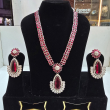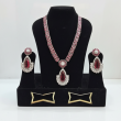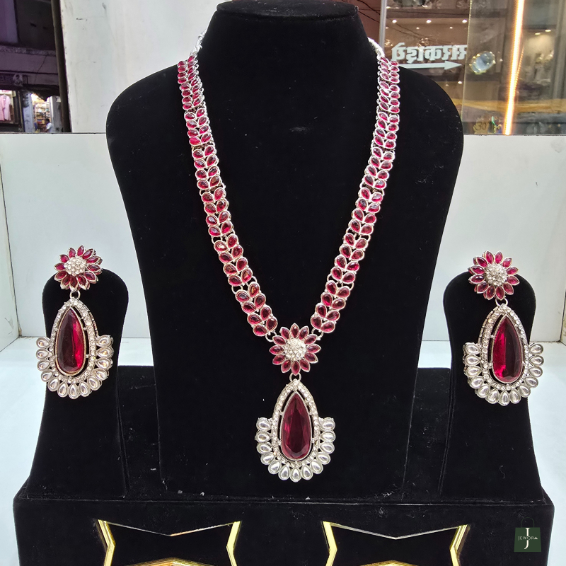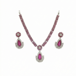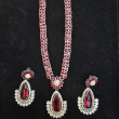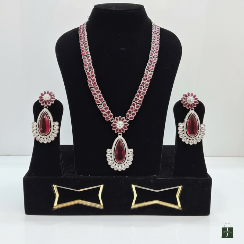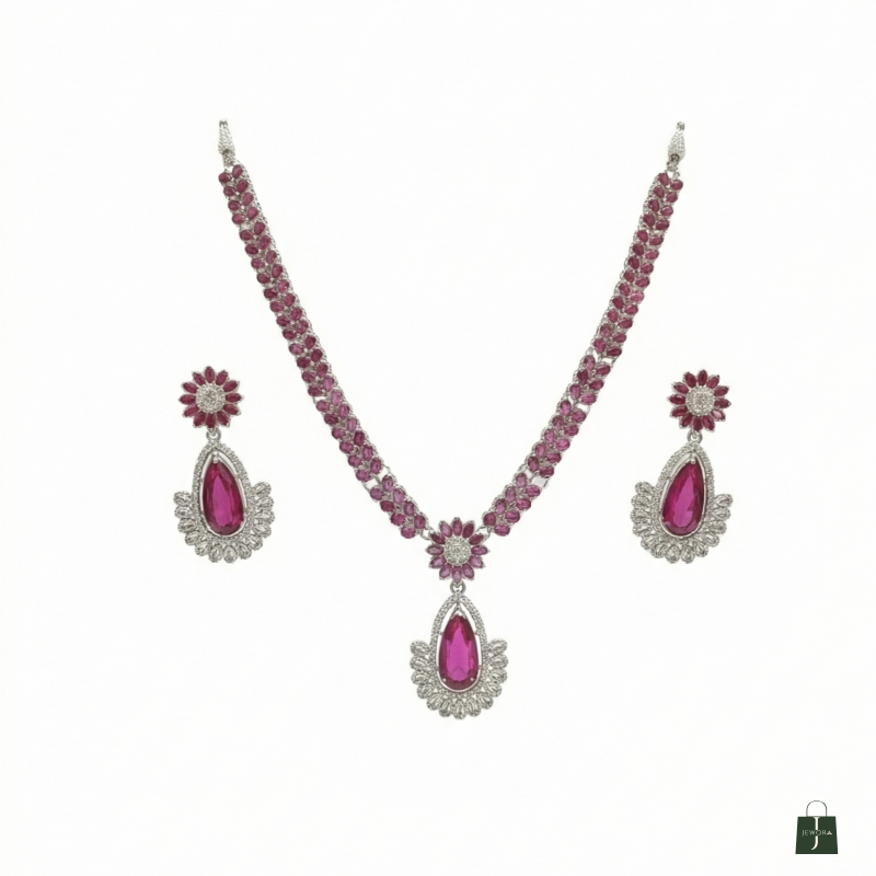 Necklace: The necklace features a double row chain of small, oval-shaped dark pink gemstones set in a silver-tone metal. In the center, there is a flower-shaped cluster of pink stones and smaller, clear, sparkling stones (resembling diamonds). Hanging from this central floral motif is a large, pear-shaped pink gemstone pendant, which is surrounded by a detailed halo of the clear stones.