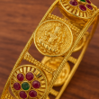 Celebrate divinity and tradition with the Lord Ganesha Ruby Emerald Kada Bangle, an exquisite piece of temple-inspired jewelry. The design highlights embossed Ganesha motifs, representing wisdom, prosperity, and good fortune. Each circular panel is bordered with intricate detailing and studded with ruby red and emerald green stones, bringing vibrance and richness to the bangle.