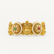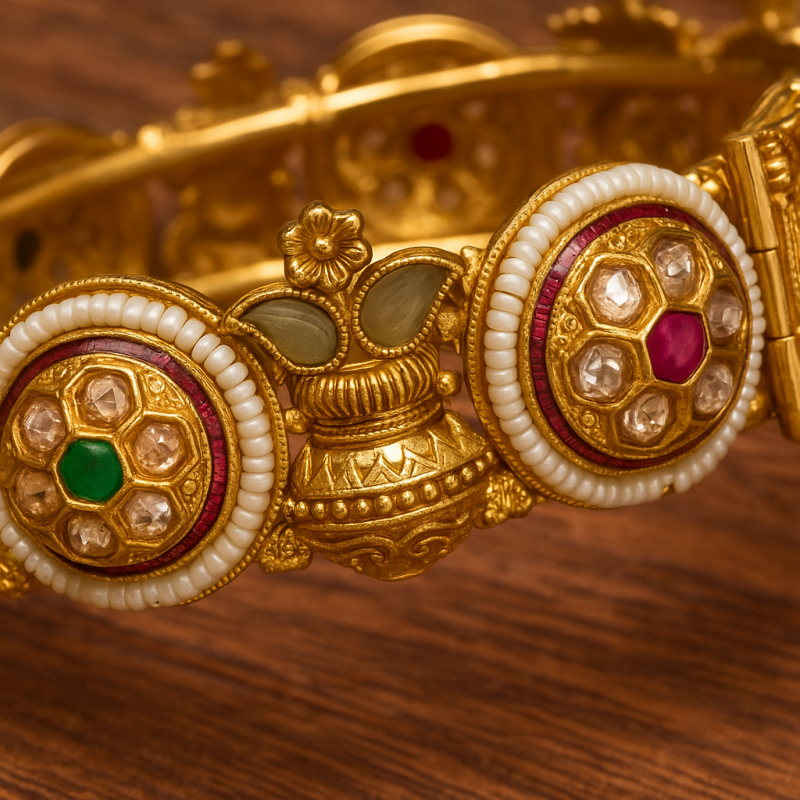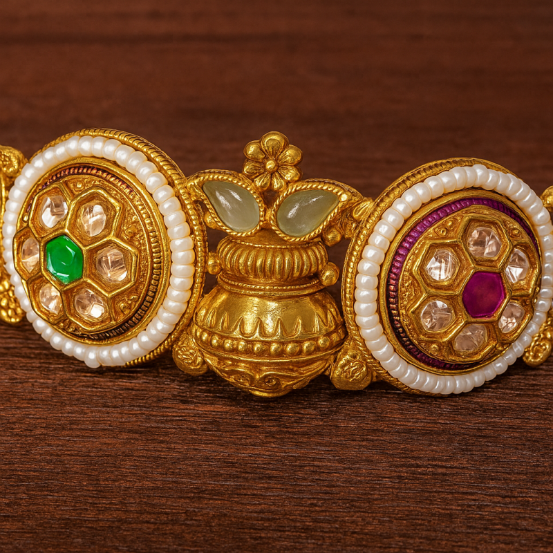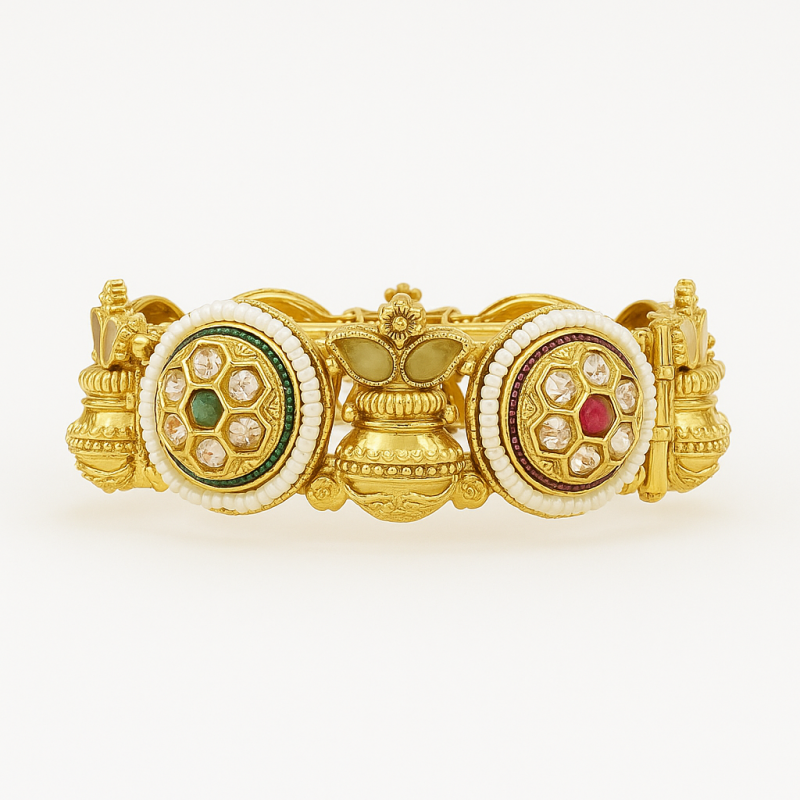 The Lotus Polki Floral Kada Bangle is a luxurious statement piece that combines traditional temple-inspired craftsmanship with regal charm. Its circular floral motifs, studded with American Diamond (CZ), Ruby Red, and Emerald Green stones, are bordered with delicate pearl beading that enhances its richness. A standout feature is the intricate lotus motif, symbolizing purity and grace, crafted with fine detailing. Finished in a radiant gold polish and designed with a secure screw closure, this kada bangle is perfect for bridal and festive occasions, adding timeless elegance to any jewellery collection.