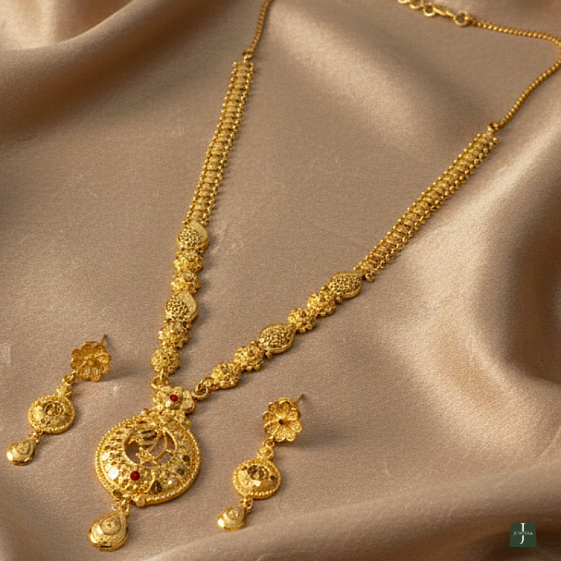 Exude timeless elegance with the Royal Mandala Heritage Mala, a gold-tone masterpiece featuring intricate floral-etched circular links. This exquisite set is centered by a magnificent open-work sunburst medallion accented with delicate ruby-toned stones. Finished with shimmering petal-shaped charms and matching drop earrings, it offers a regal silhouette for weddings and grand festivities.