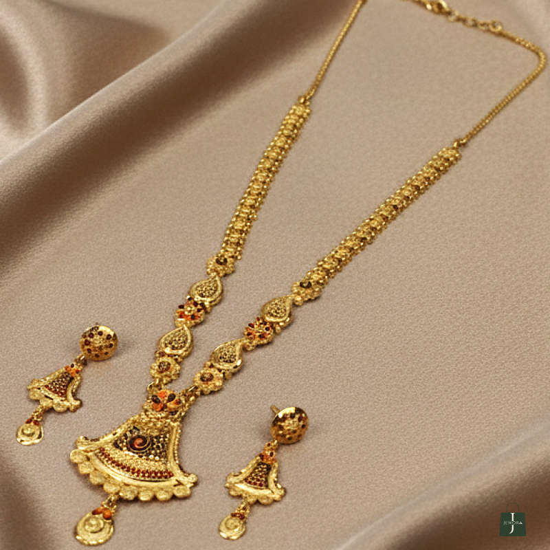 Capture the essence of tradition with the Royal Paisley Fan Mala, a gold-tone masterpiece featuring a chain of elegant paisley-shaped links. The set is anchored by a magnificent trapezoidal fan-shaped pendant adorned with vibrant enamel-style accents and delicate floral motifs. Paired with matching statement earrings, this ensemble offers a regal and sophisticated silhouette for any grand occasion.