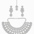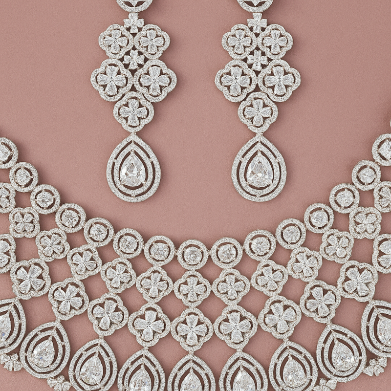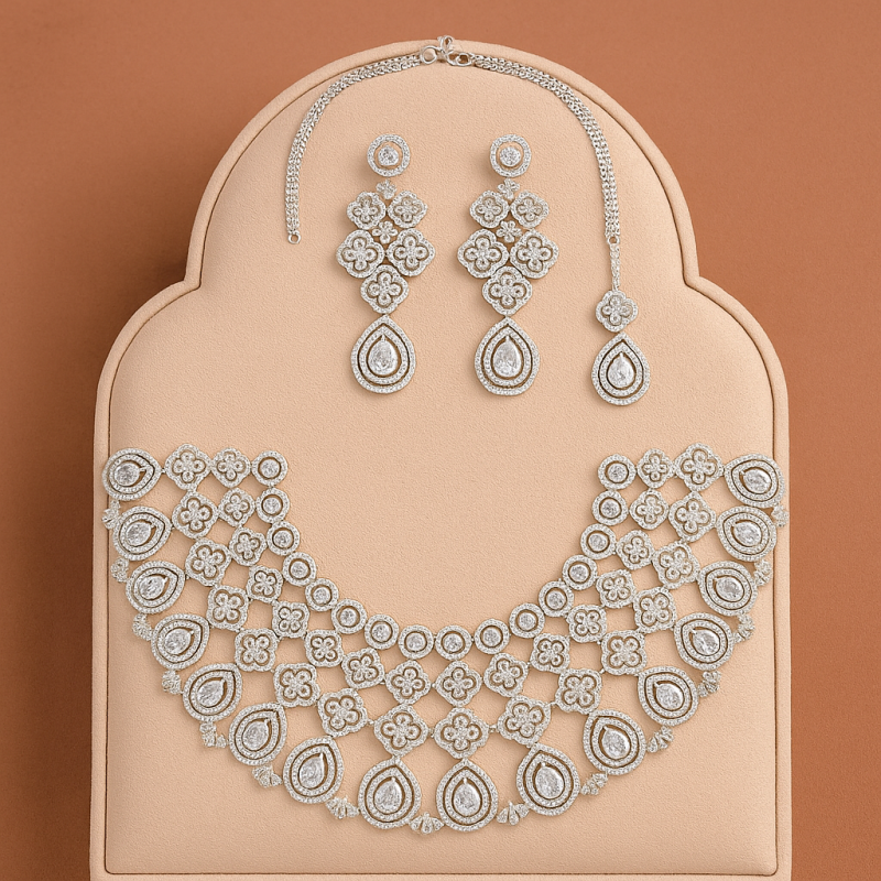 Step into radiance with the Lustre Lattice Necklace Set, a breathtaking creation that exudes grace and grandeur. Designed with a cascading lattice of shimmering American Diamonds (CZ), this statement piece captures light from every angle. The intricate geometric and floral motifs flow seamlessly into pear-shaped drops, giving the necklace an exquisite finish. Matching chandelier-style earrings and a delicate maang tikka complete the set, making it perfect for bridal occasions, festive gatherings, or any event where you want to shine effortlessly. With its regal charm and meticulous craftsmanship, this set transforms traditional elegance into a dazzling modern masterpiece.