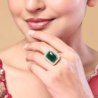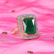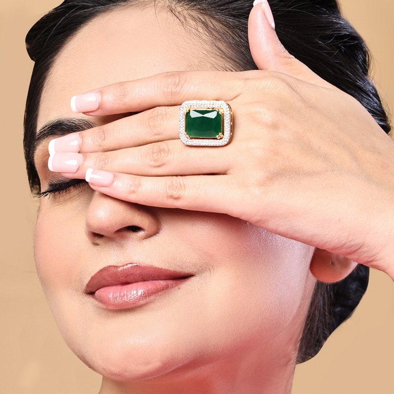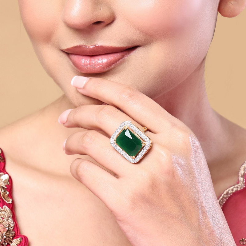 Make a bold and luxurious statement with this stunning emerald cocktail ring. Featuring a rich green centerpiece stone, this ring exudes elegance and royal charm. The vibrant emerald hue is beautifully complemented by a polished finish, creating a captivating sparkle that instantly draws attention. Designed to stand out, this cocktail ring adds a touch of sophistication to both traditional and western outfits. Perfect for parties, weddings, and special occasions, it is a must-have accessory for those who love timeless glamour.