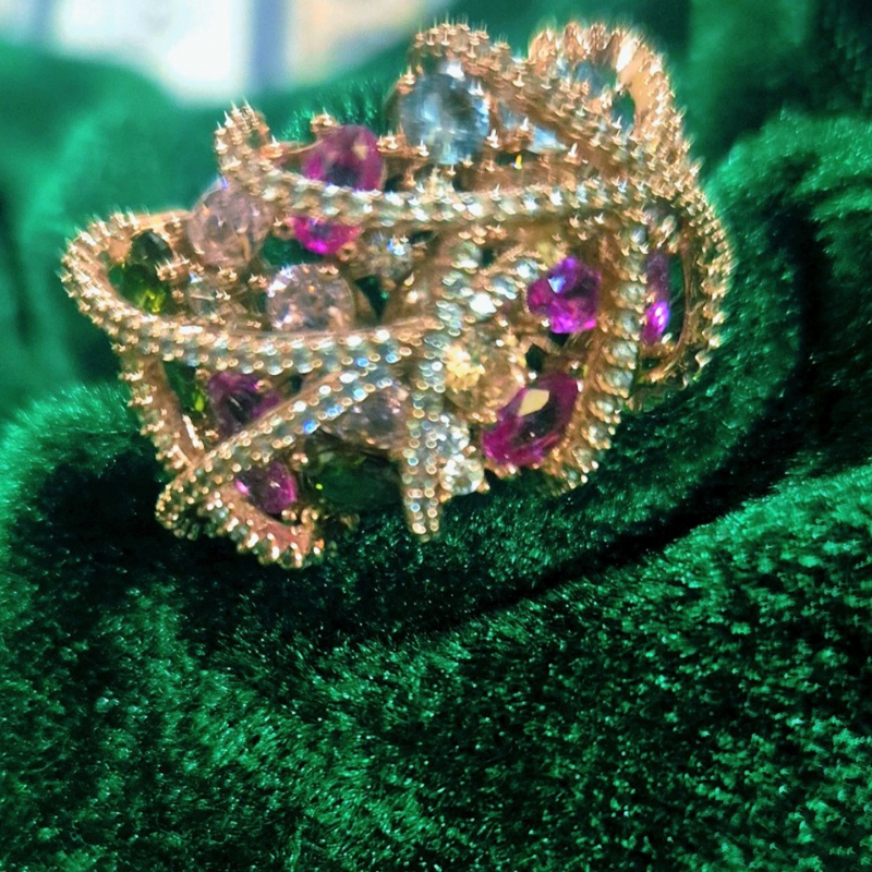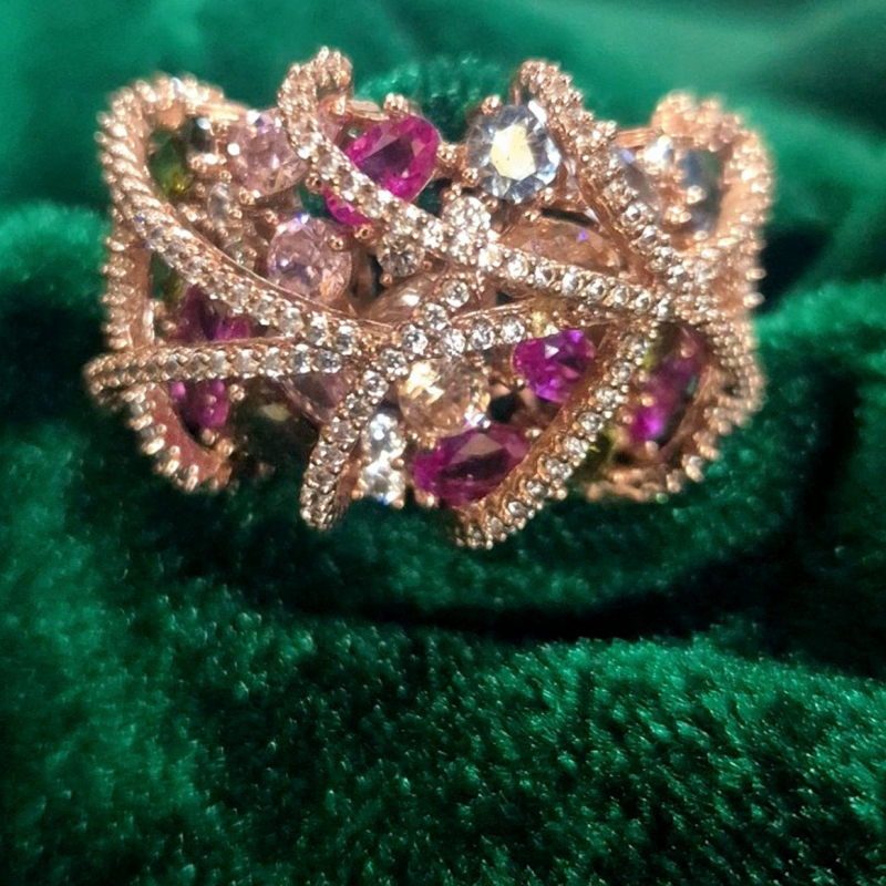Elevate your style with this luxurious multicolor crystal statement ring, crafted in an intricate floral-inspired openwork design. Adorned with vibrant pink, champagne, and subtle green-toned crystals, the ring sparkles beautifully from every angle. The rose gold-tone finish adds a soft, premium touch, making it a perfect blend of elegance and modern glamour. Designed to stand out, this ring is ideal for special occasions, parties, and festive wear, adding a bold yet sophisticated statement to your look.