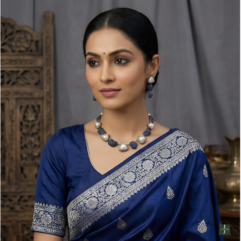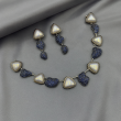 Elevate your ethnic look with this Luxurious Sapphire Blue American Diamond Jewellery Set. This exquisite imitation jewellery set features stunning blue stones and lustrous accents, perfect for weddings and festive occasions.