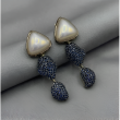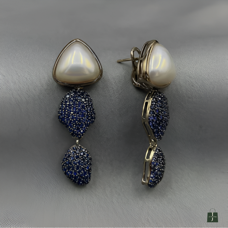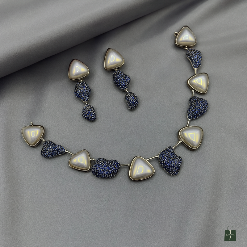 Design: Contemporary necklace featuring alternating pearl-white triangular elements and sapphire-blue American Diamond clusters in a bold geometric pattern. The matching three-tier drop earrings showcase triangle studs followed by two cascading blue AD clusters for a striking modern look.