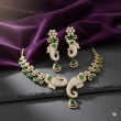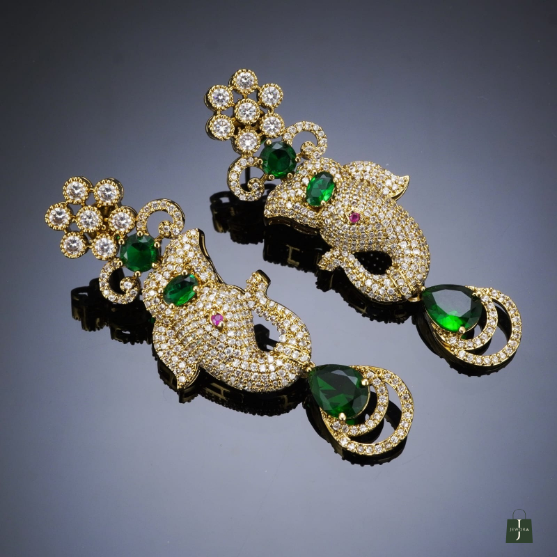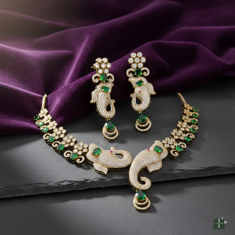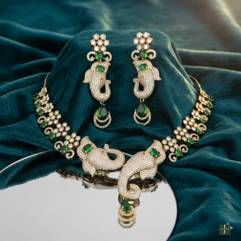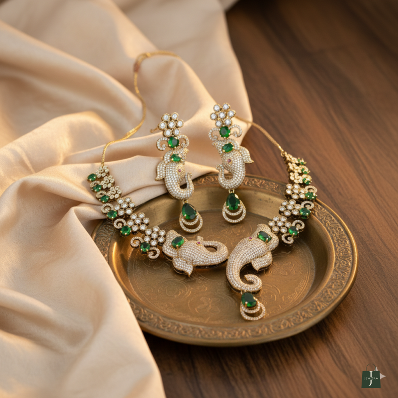 ELEGANT DESIGN: Features intricate elephant trunk designs inspired by Lord Ganesha, embellished with floral clusters and teardrop green stones, creating a sophisticated ethnic Indian Bollywood style statement piece