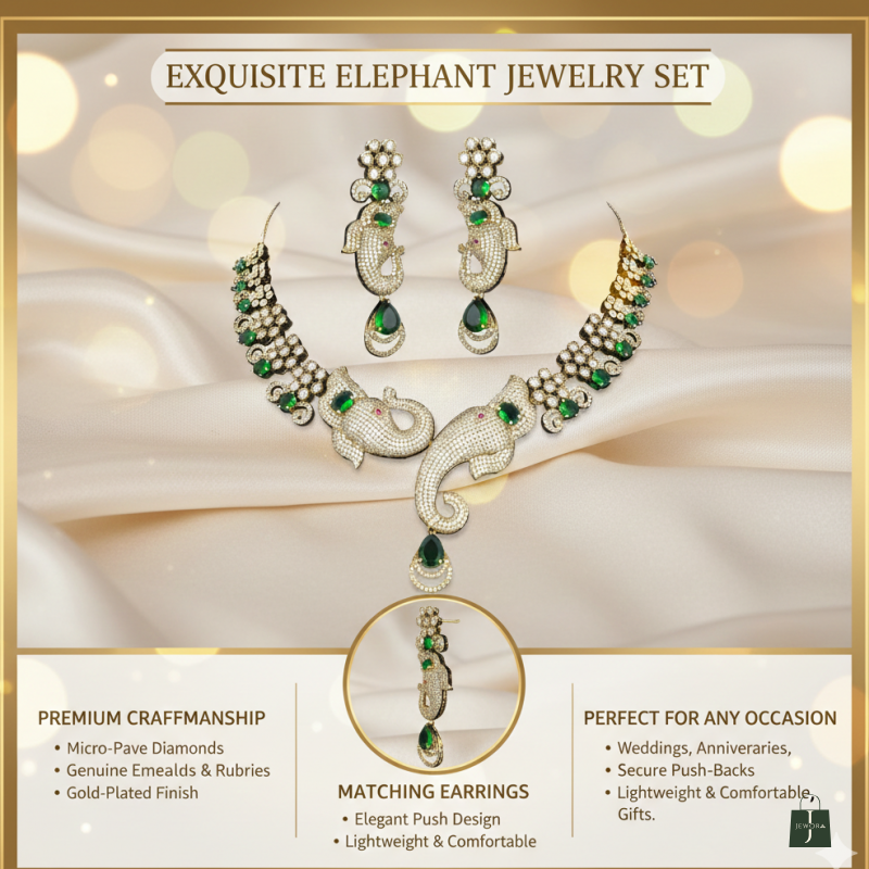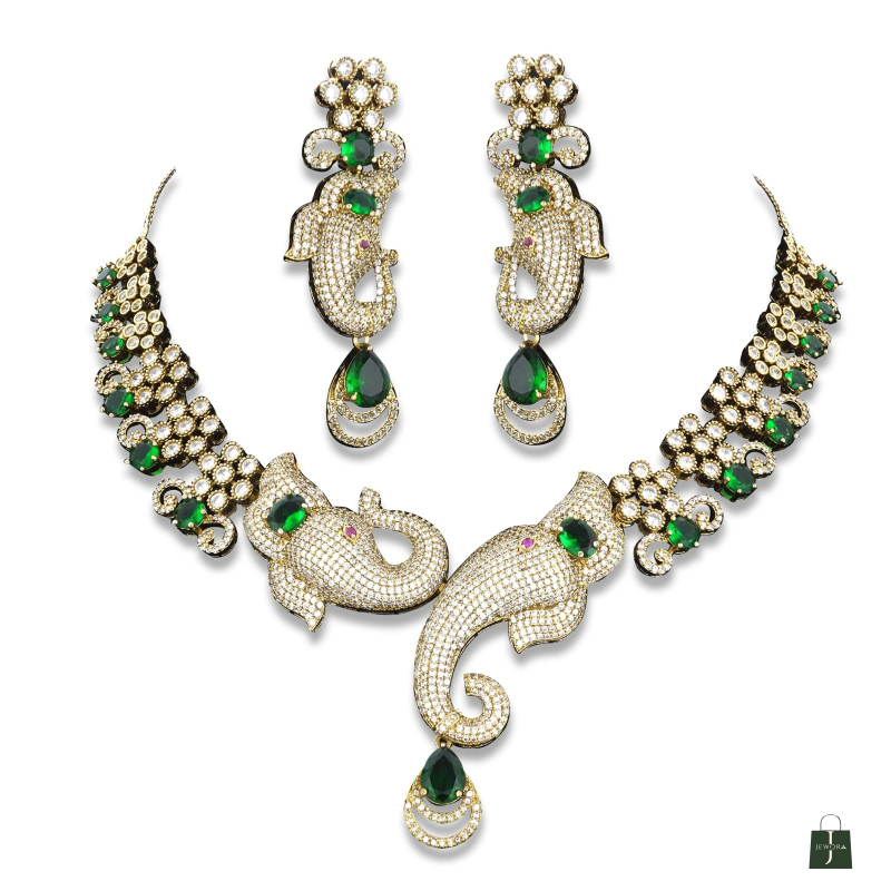 Luxury 18K Gold Plated Emerald Green & Diamond CZ Elephant Jewelry Set for Women - Ganesha Inspired Necklace and Drop Earrings - Indian Bridal Wedding Statement Jewelry | Traditional Lord Ganesha Insp