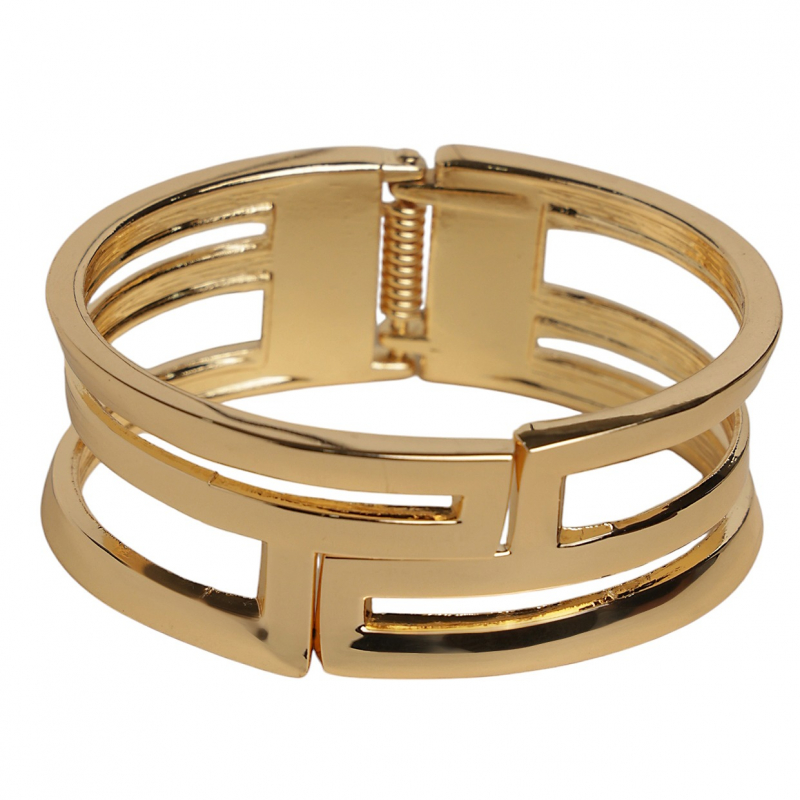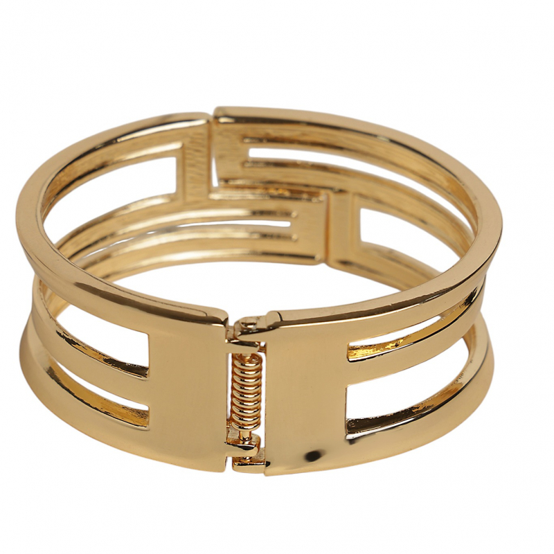 Make a bold style statement with this luxurious geometric open cuff bracelet. Designed with sleek cut-out detailing and a modern structured silhouette, this piece exudes elegance and sophistication. The high-shine gold-tone finish gives it a premium look, perfect for elevating both casual and formal outfits. Crafted for comfort and style, this bracelet is an ideal accessory for fashion-forward individuals who love minimal yet impactful jewelry.