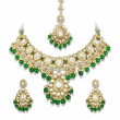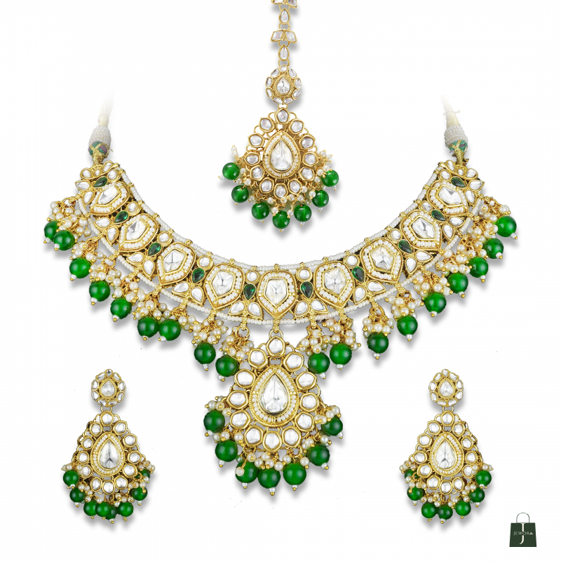 Luxury Handcrafted Emerald Green Bead & Kundan Choker Necklace Set - Premium Gold Plated Polki Jewelry for Women with Matching Statement Earrings & Tikka | Traditional Rajasthani Jadau Style Jewellery