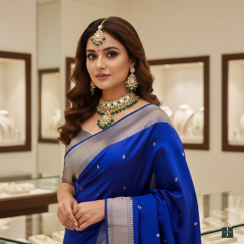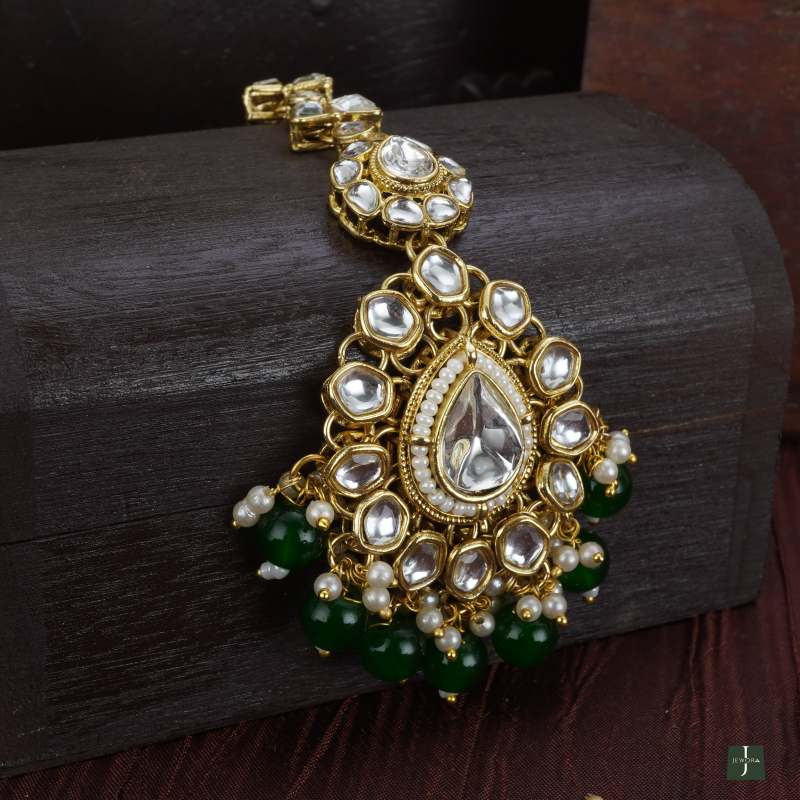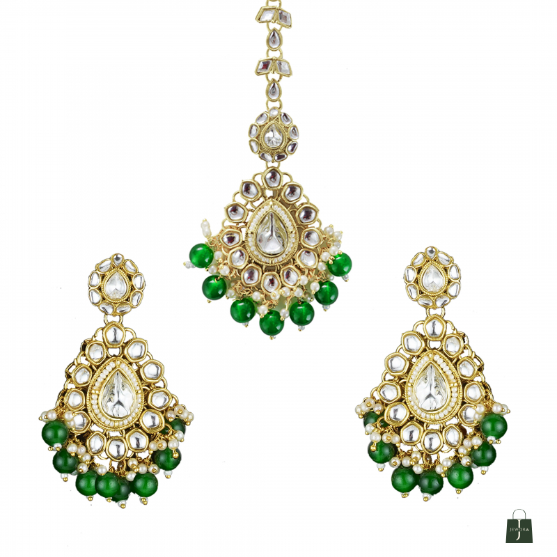 ✨ EXQUISITE HANDCRAFTED ARTISTRY: Every piece from the Sparkling Dreams collection is meticulously handcrafted by master artisans. This necklace set features high-grade, precision-cut Kundan stones and lustrous emerald-green onyx beads, offering a rich, heritage look that is indistinguishable from real gold jewelry. 👑 COMPLETE ROYAL BRIDAL SUITE: Elevate your ethnic ensemble with this comprehensive 4-piece set. It includes a stunningly detailed Choker Necklace, a pair of matching Statement Drop Earrings, and a regal Maang Tikka. Perfectly coordinated to give you a majestic, "Maharani" look for your biggest moments.