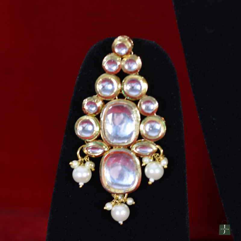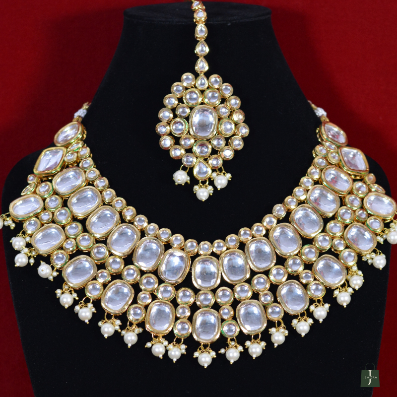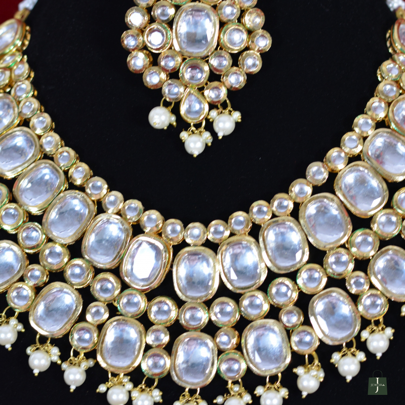This luxury Polki Kundan pearl statement necklace set showcases traditional artistry with a premium finish at an accessible price. Featuring high-shine Polki stones, classic Kundan settings, and delicate pearl drops, it delivers royal elegance, rich detailing, and comfortable wear—ideal for weddings, festive occasions, and heritage-inspired styling.