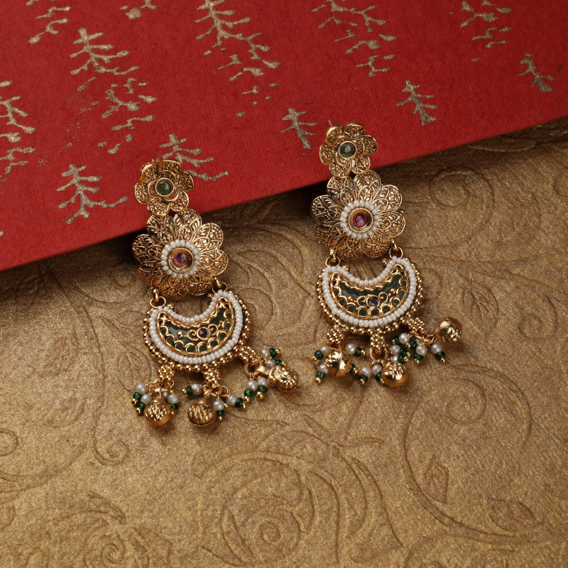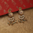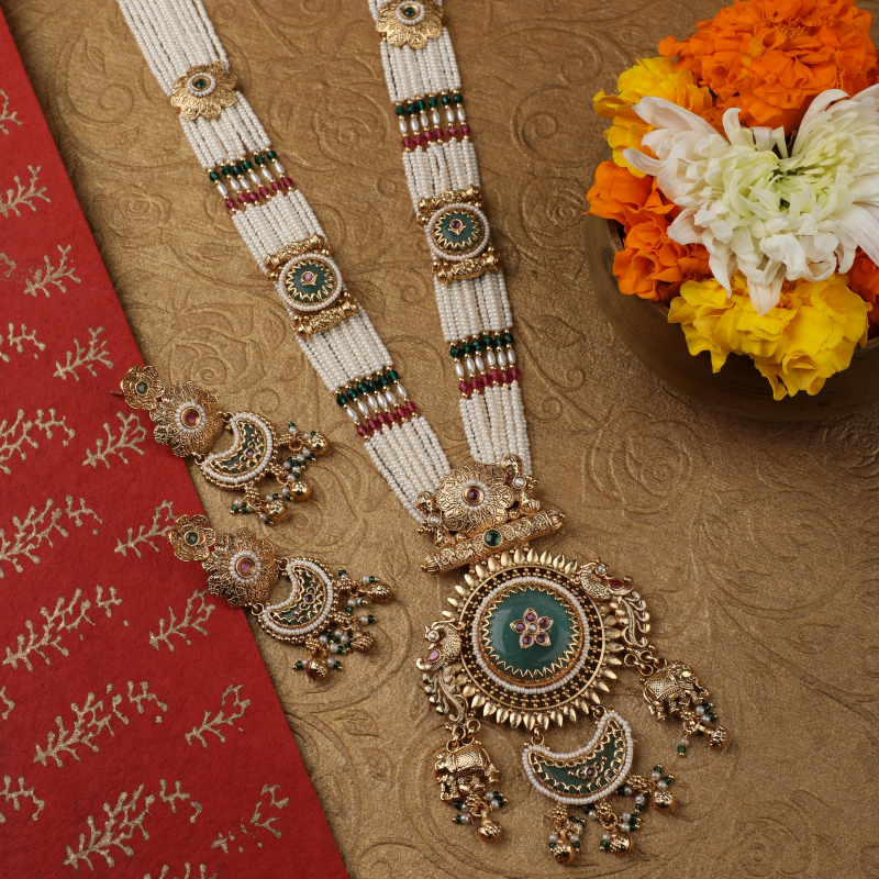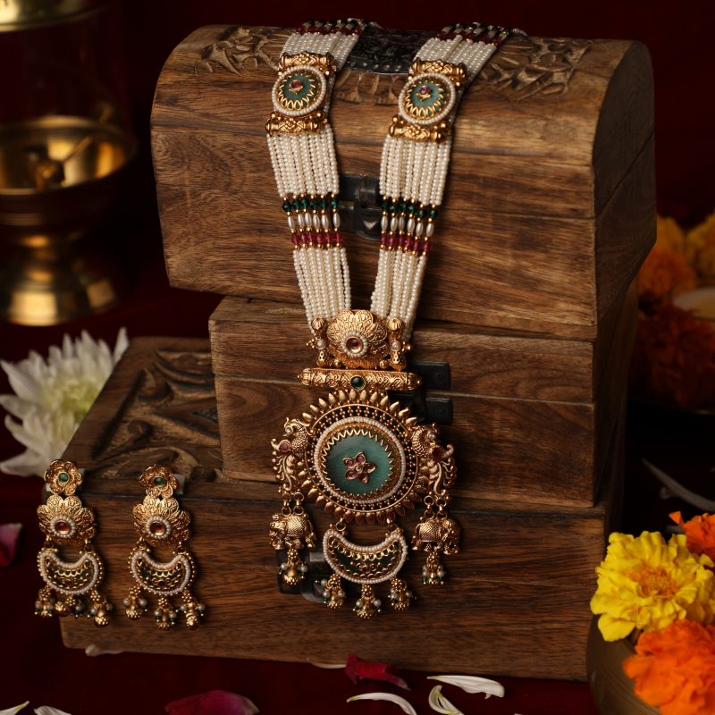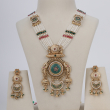 At the center lies an intricately carved circular Kundan pendant with green enamel detailing, framed by ornate gold-tone craftsmanship. The pendant is further enhanced with graceful dangling motifs and pearl clusters, creating movement and visual drama. Matching statement earrings echo the same design language, completing the set with perfect symmetry and elegance.